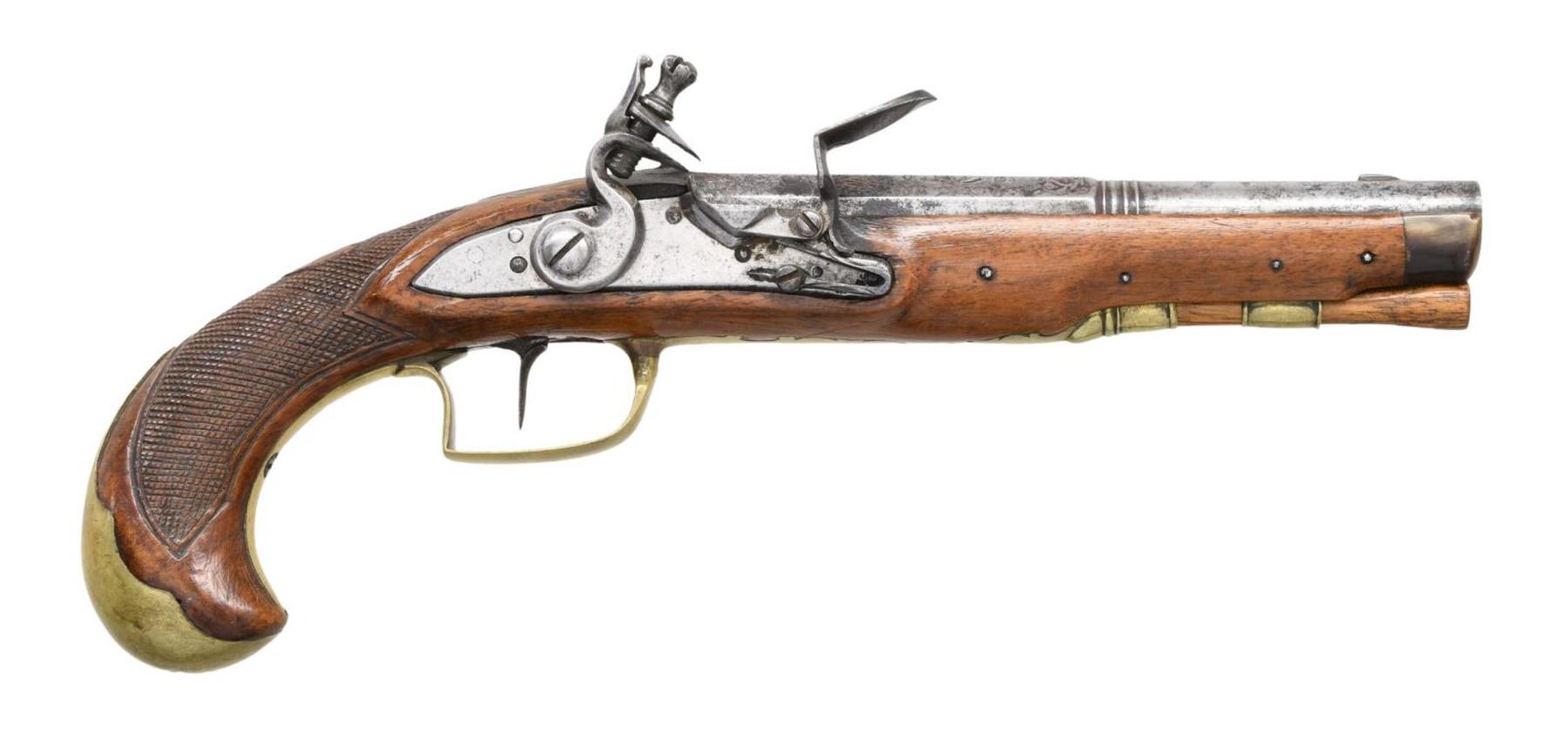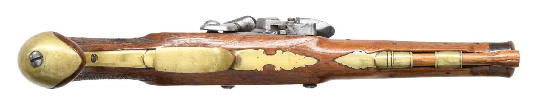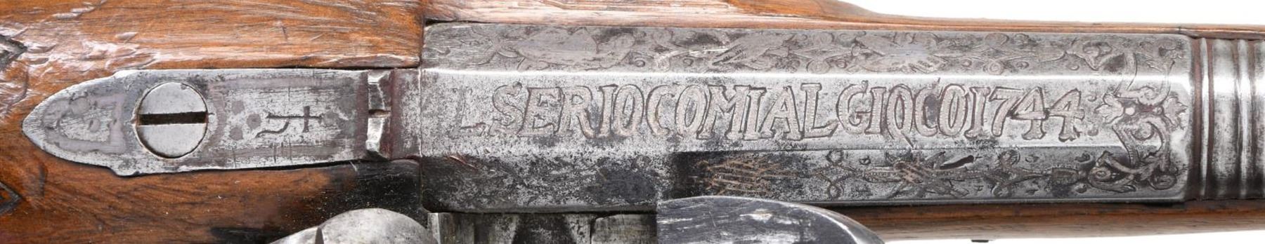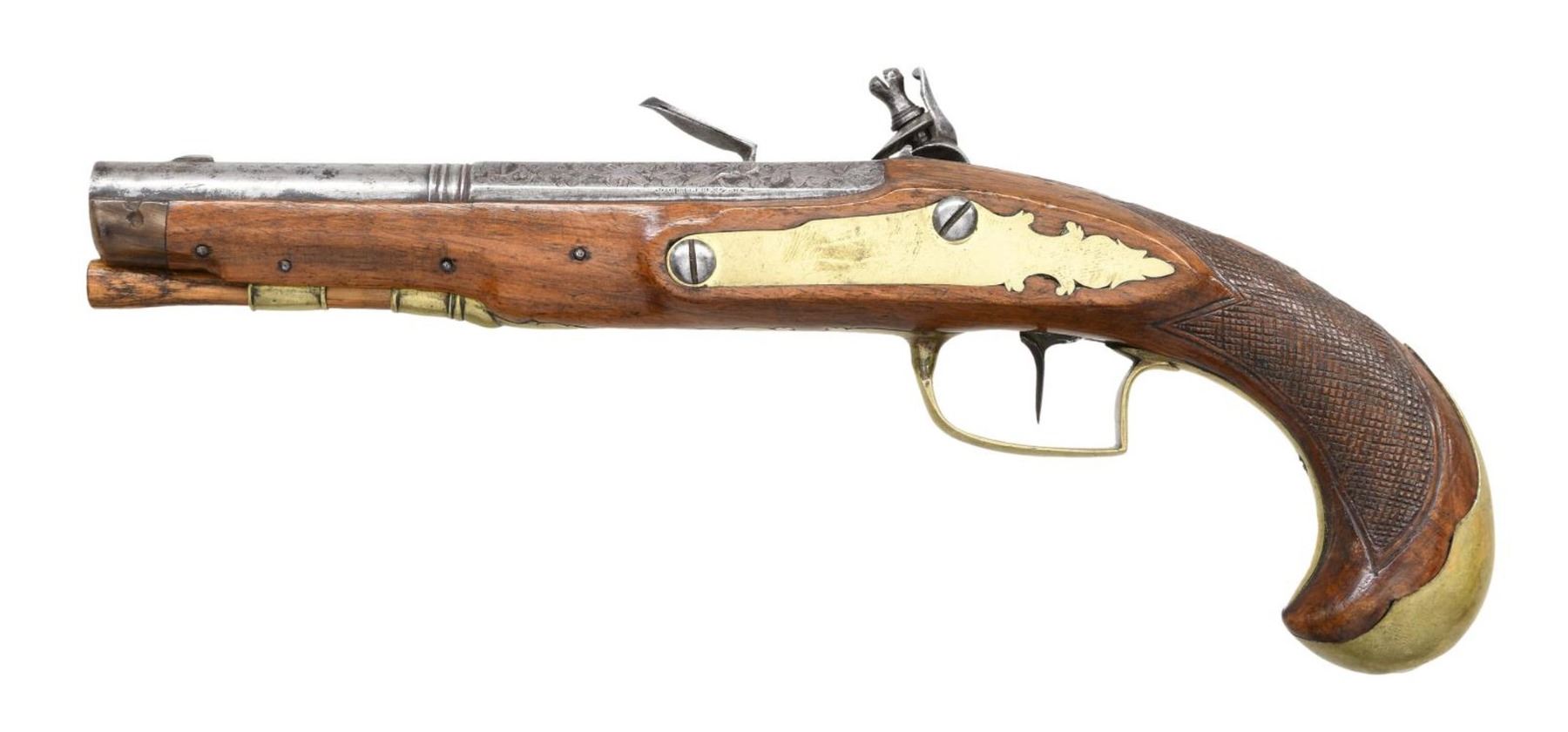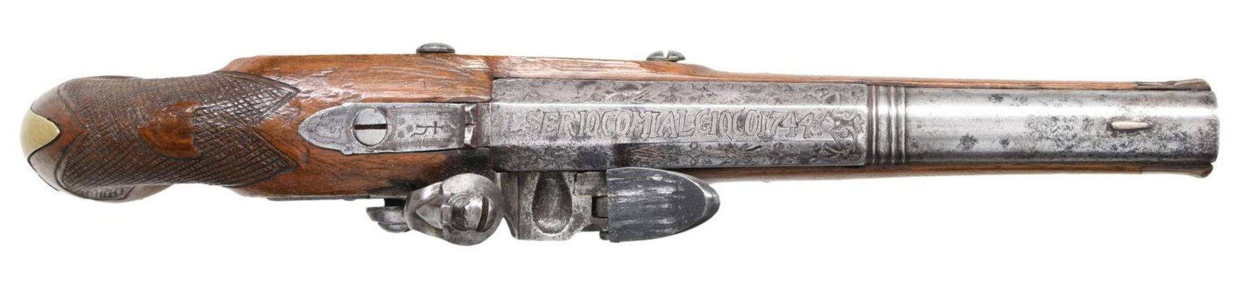 Cal. 48 rifled. NSN. The 6" octagon to round barrel is silver inlaid "L SERIOCOMIAL GIOCO 1744" on top flat. There is also fancy silver inlay on flanking flats. Small lock with chamfered plate has serpentine cock, inset faceted pan, bridled friction frizzen and feather spring with foliate finial. Stock with checkered birds head grip extends to muzzle with horn cap and is pinned to barrel. Pistol is brass mounted. Mounts are flush with filed in fancy outlines. Hickory ramrod is held by single beaded brass pipe and matching thimble. CONDITION: good. Iron parts cleaned to silver gray. Stock with old possible original finish. Brass once cleaned is beginning to tone. Silver inlay is considerably rubbed. Bore is pitted. Mechanically good. (01-24342/MGM). ANTIQUE. $1,500-2,500.