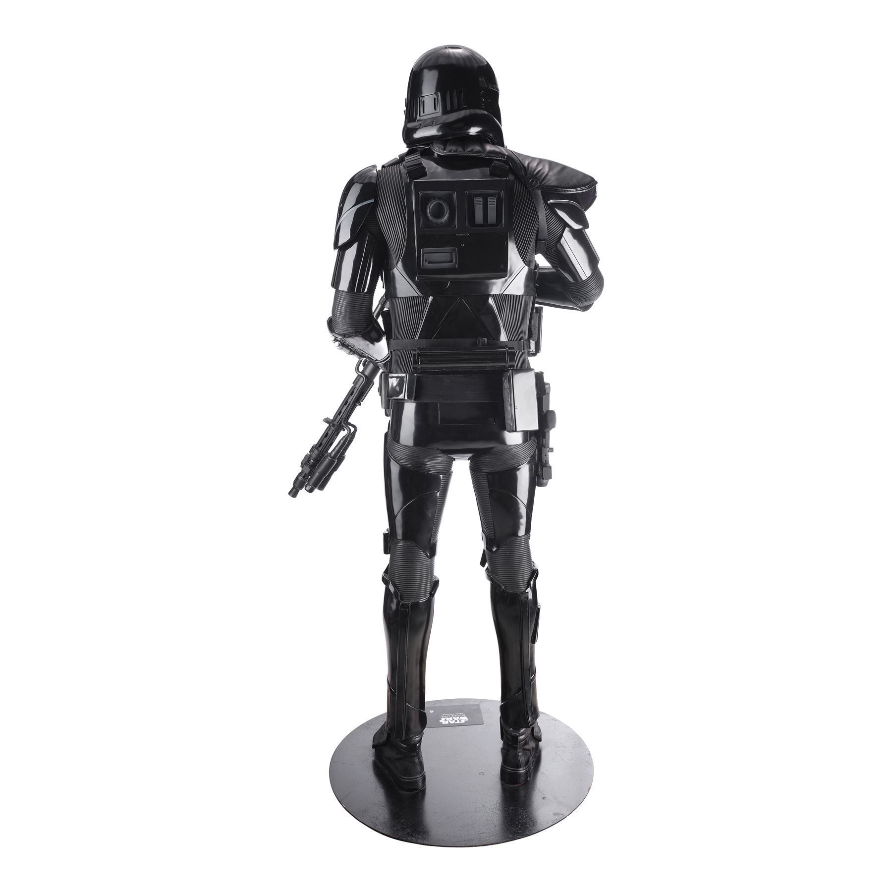 Modeled by Lucasfilm licensee Anovos based on 3D scans of the Death Troopers' original production costumes, this ornately detailed, full-size statue is constructed from fiberglass and resin paneling with leatherette and metal detailing throughout. Its all-black costume includes a high-tech helmet adapted from the Stormtrooper helmets first seen in Star Wars: A New Hope, as well as shoulder pads, body-, chest-, and thigh armor, pairs of braces, greaves, and gloves, an ammunition and tool pouch equipped with three C-25 fragmentation grenades, a utility belt with an Imperial buckle at center, a SE-14r light-repeating blaster on the right hip, and two rubber-padded boots.