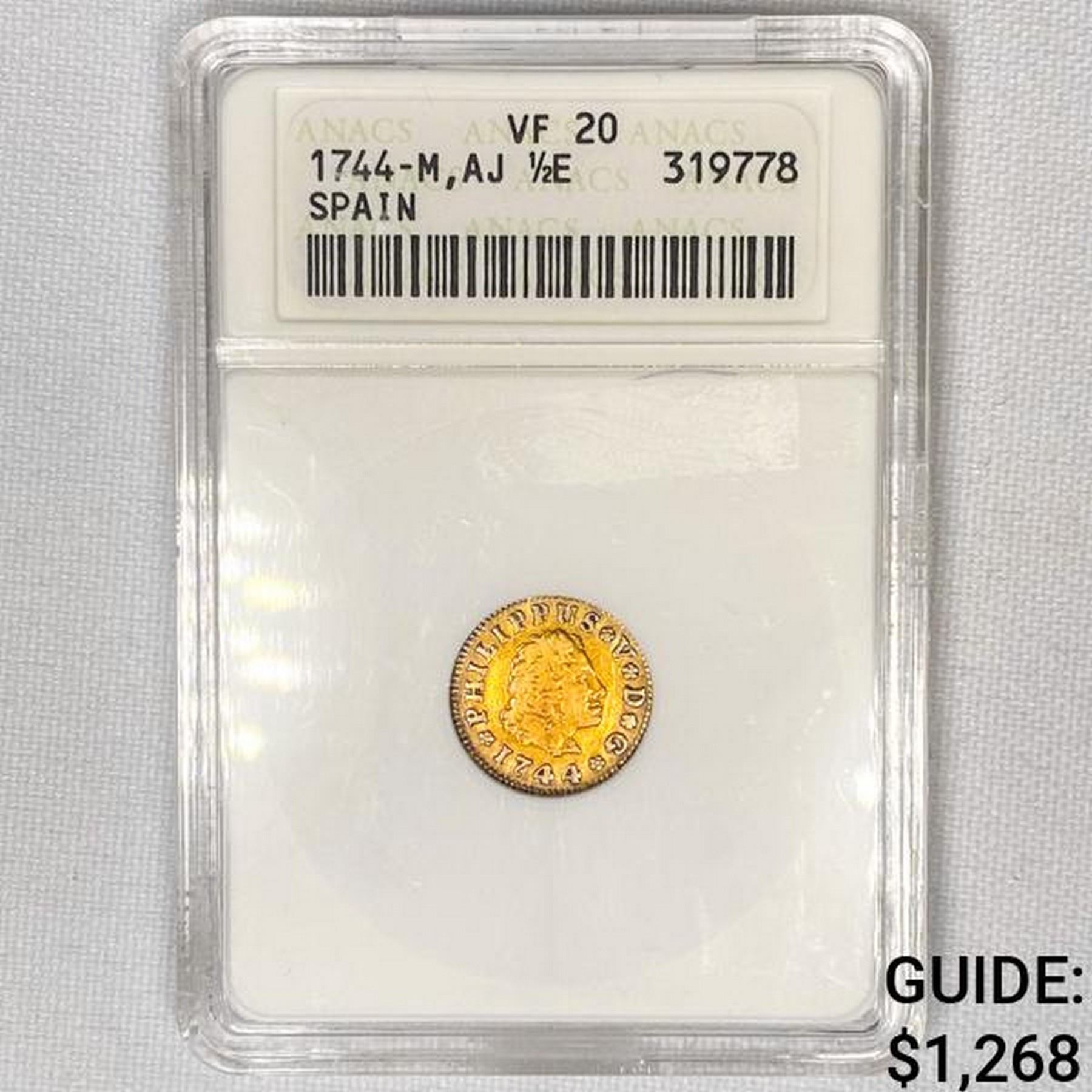 1744-M,AJ Spain Gold 1/2 Escudo ANACS-VF20