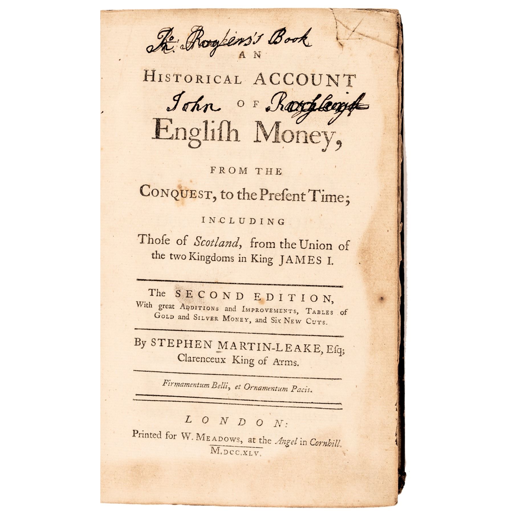 A rare, historically significant Numismatic Reference, fully titled: “An Historical Account of English Money from the Conquest, to the Present Time, Including Those of Scotland, the the Union of the Two Kingdoms in King James I. - The Second Edition, With great Additions and Improvements, Tables of GOLD and SILVER MONEY, and Six New Cuts. (plates) - By Stephen Martin-Leake, Esq; Clarenceux King of Arms. - London: Printed for W. Meadows, at the Angel in Cornhill. - M.DCC.XLV (1745).” Book has 428 pages, plus Two Tables: “English Silver Coins” and “English Gold Coins” with 14 drawn and engraved Coin Illustration plates. This copy is in pleasing clean condition, complete with its original leather boards worn from use present yet detached. Prior owner’s name written in ink on the Title Page which also has some mild edge tone, apparently transferred from the front cover, and has a trivial .5” top edge split. Deaccessioned Ex: Woburn, Massachusetts Public Library with Book Plate. An important, beautifully written, very extensive reference work that is lacking in most institutional and private library collections.