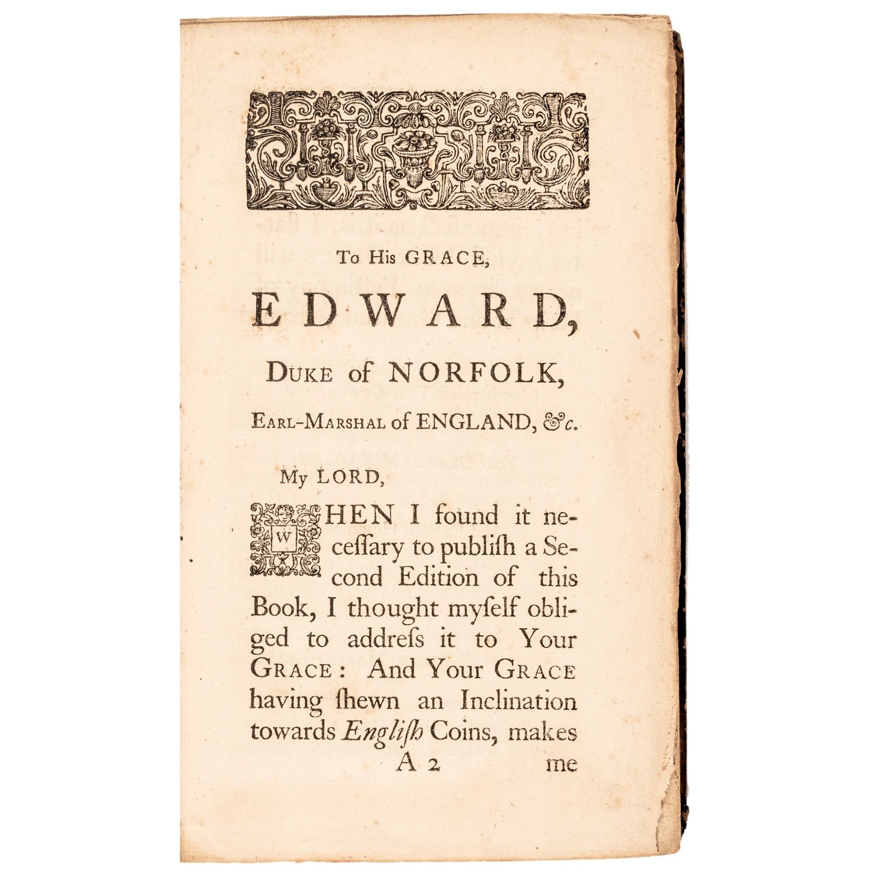 An illustrated 2nd edition of this detailed work on the history of English coins, Illustrated with fourteen engraved descriptive plates of the coins of the realm. The work was first published under the title, “Nummi Britannici Historia: or an Historical Account of English Money.” It is an exceedingly rare early reference book on English, Scottish and related Numismatics, this complete copy in its updated and expanded 2nd edition. We could only locate one copy, a later issued 3rd edition highly defective torn copy dated to “1793” (48 years later) available for purchase at a London Numismatic firm. Our current offering is in vastly superior quality and is apparently the best library edition.