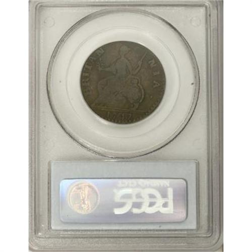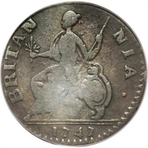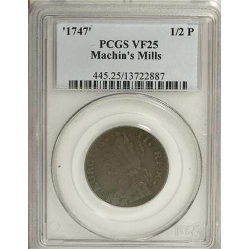 <B>1747 1/2P Machin's Mills Halfpenny VF25 PCGS.</B></I> Vlack 1-47A, R.5. Only five examples of this rare Machin's Mills date have been certified by PCGS. The planchet is problem-free, and the dark brown fields and devices show little indication of verdigris. Slightly off center toward 3 o'clock, although all legends are intact. Listed on page 64 of the 2008 <I>Guide Book</B></I>. Population: 1 in 25, 1 finer (12/07).<BR><BR><b>Shipping:</b> Coins & Currency (<a target="_blank" href="http://www.heritageauctions.com/common/shipping.php">view shipping information</a>)