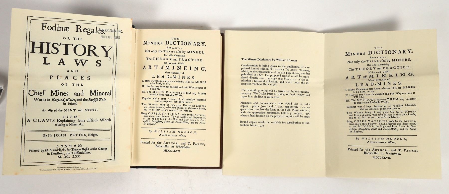 1979 reprint in slipcase. The Miners Dictionary. "Explaining Not only the Terms used by Miners, but also Containing the Theory and Practice of that most Useful Art of Mining, More especially Lead-Mines..." BY William Hooson, A Derbyshire Miner. Not paginated. Very good condition. 8 x 5"