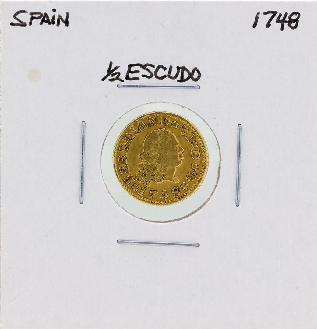 One 1748 Ferdinand VI Spanish 1/2 Escudos Gold Coin.