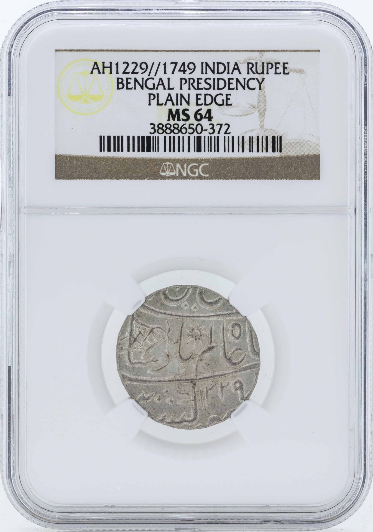 One 1749 India Rupee Bengal Presidency Plain Edge Coin NGC MS64.