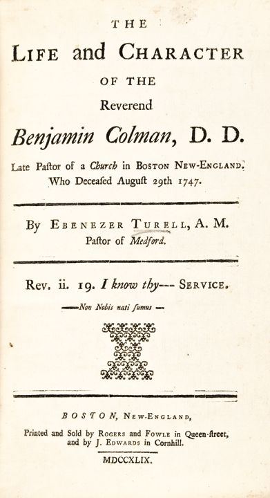 1749-Dated Colonial America, Original 1749 Edition Boston Hardcover Book, "THE LIFE AND CHARACTER OF THE REVEREND BENJAMIN COLMAN, D.D.; LATE PASTOR OF A CHURCH IN BOSTON NEW-ENGLAND. WHO DECEASED AUGUST 29TH 1747." Choice Very Fine
