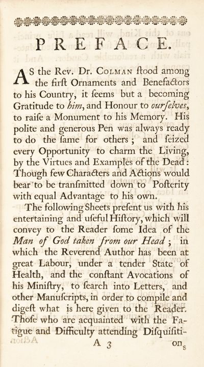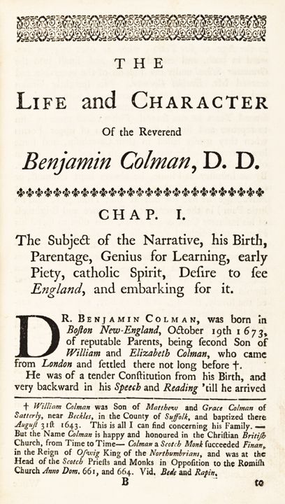 "Benjamin Coleman was the Puritan minister whose tract on 'The Government and Improvement of Mirth' demolished for perceptive posterity the cliche of New England Puritans as a humorless lot. But Colman's career, beginning at the turn of the eighteenth century, also reflects significant, if subtle, changes in New England Puritanism, and in literary taste as well." [Meserole, Harrison T.; American Poetry of the Seventeenth Century. Pennsylvania State University, 1985].