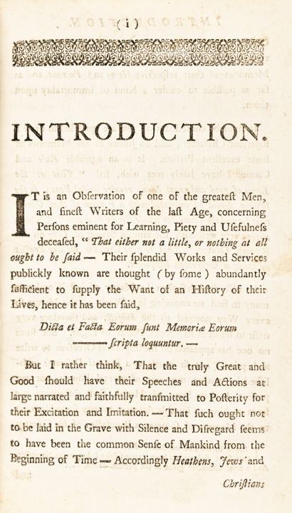 This extremely rare 18th Century treatise was written by Ebenezer Turell (1702-1778) and printed by Rogers, Fowle, and J. Edwards, Boston. Author was a Harvard graduate, noted patriot and longtime minister in Medford, Massachusetts. Benjamin Colman (1673-1747) was noted Puritan nonconformist who did much to forever alter the course of Puritanism in America. This very rare and historic book remains in nice condition. It is bound in rebacked contemporary calf [leather] with red spine label, having light to moderate cover wear, with the hinges neatly reinforced with cloth tape, lacking the half-title with a corner piece excised from front blank, scattered foxing, and generally clean internally. Volume collates: [14 (of 16)], i, [3], 238, [2] pages; and measures approx 8" tall x 5.5" wide x 1" thick. WorldCat locates only two institutionally held copies in book form; at Harvard and Memorial University of Newfoundland. [Evans 6434].