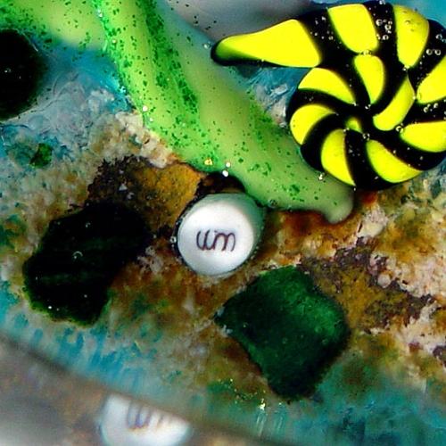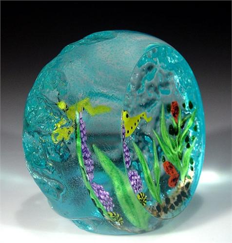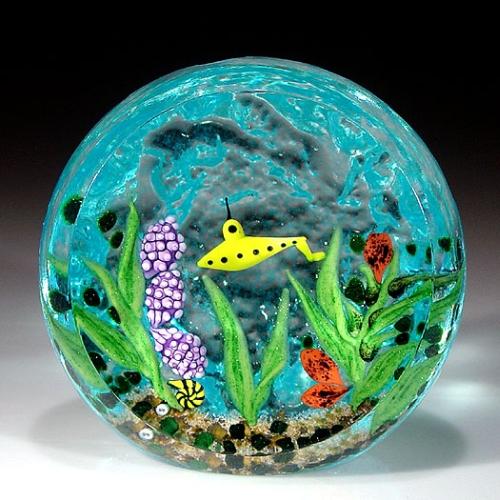 William Manson 1999 "Yellow Submarine" upright paperweight, with a bright-yellow submarine, submerged in a blue sea with seaweed, shells, coral, and green aventurine rocks. Front window facet. Signature cane. Signed/dated. Edition # 16 of a limited edition of 100. Diameter 3 3/8". NO RESERVE