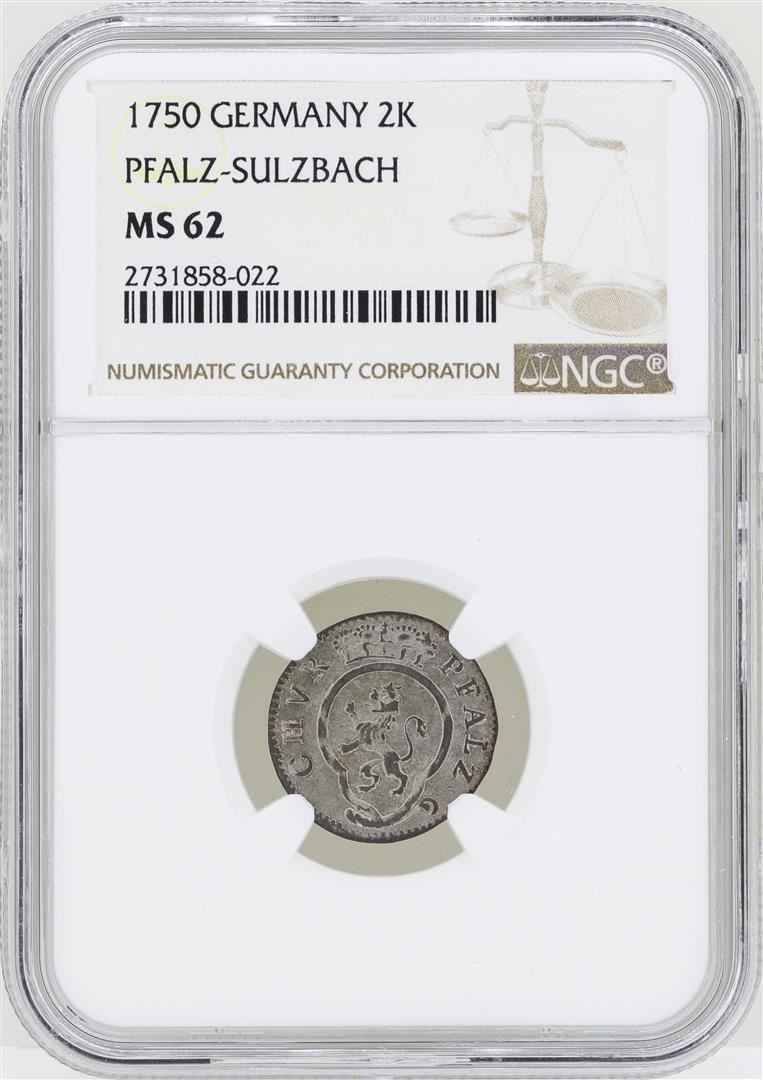 One 1750 Germany 2 Kreuzer Pfalz-Sulzbach Coin NGC MS62. NGC Certified.