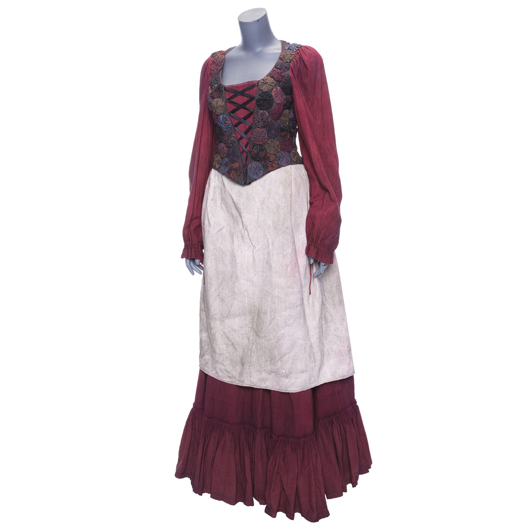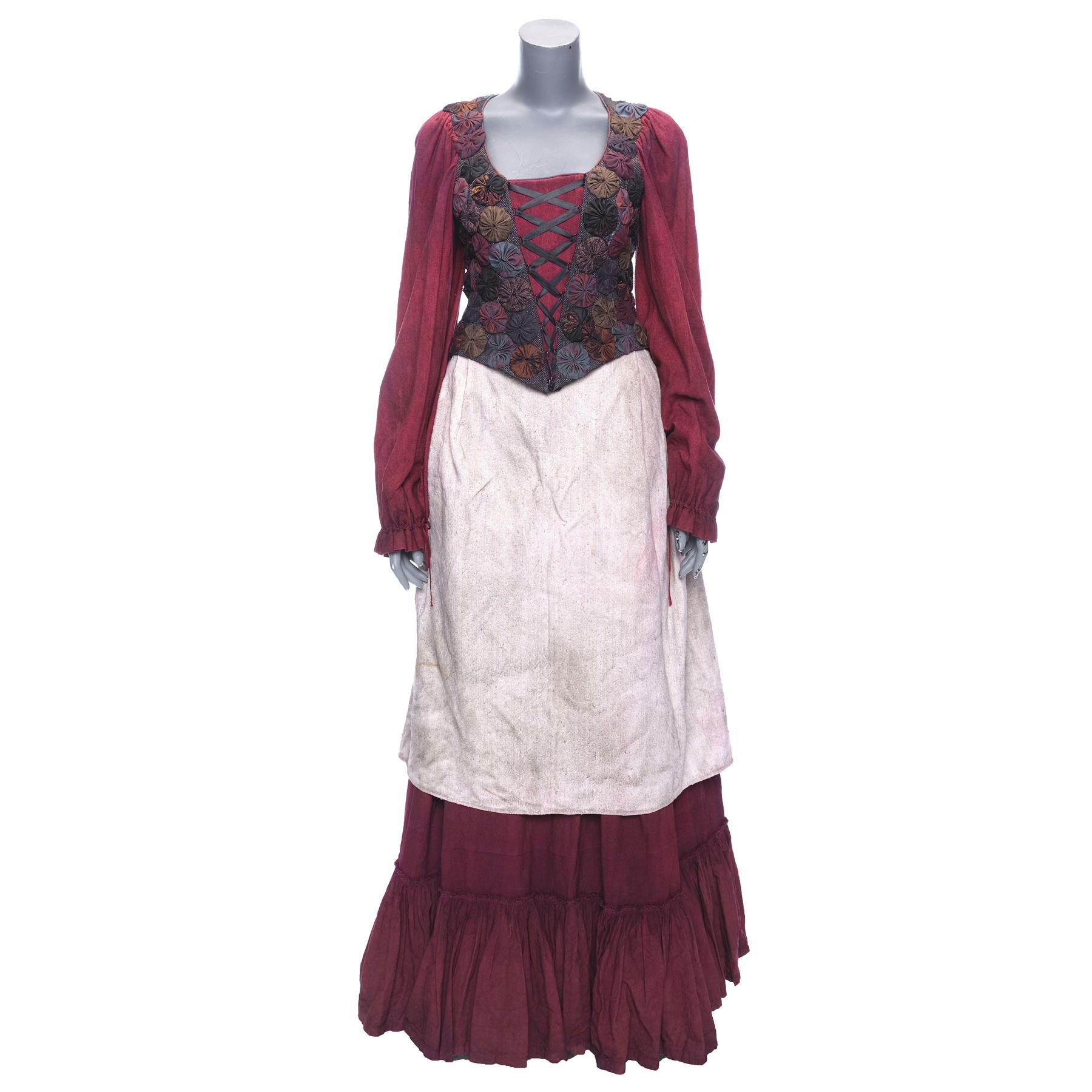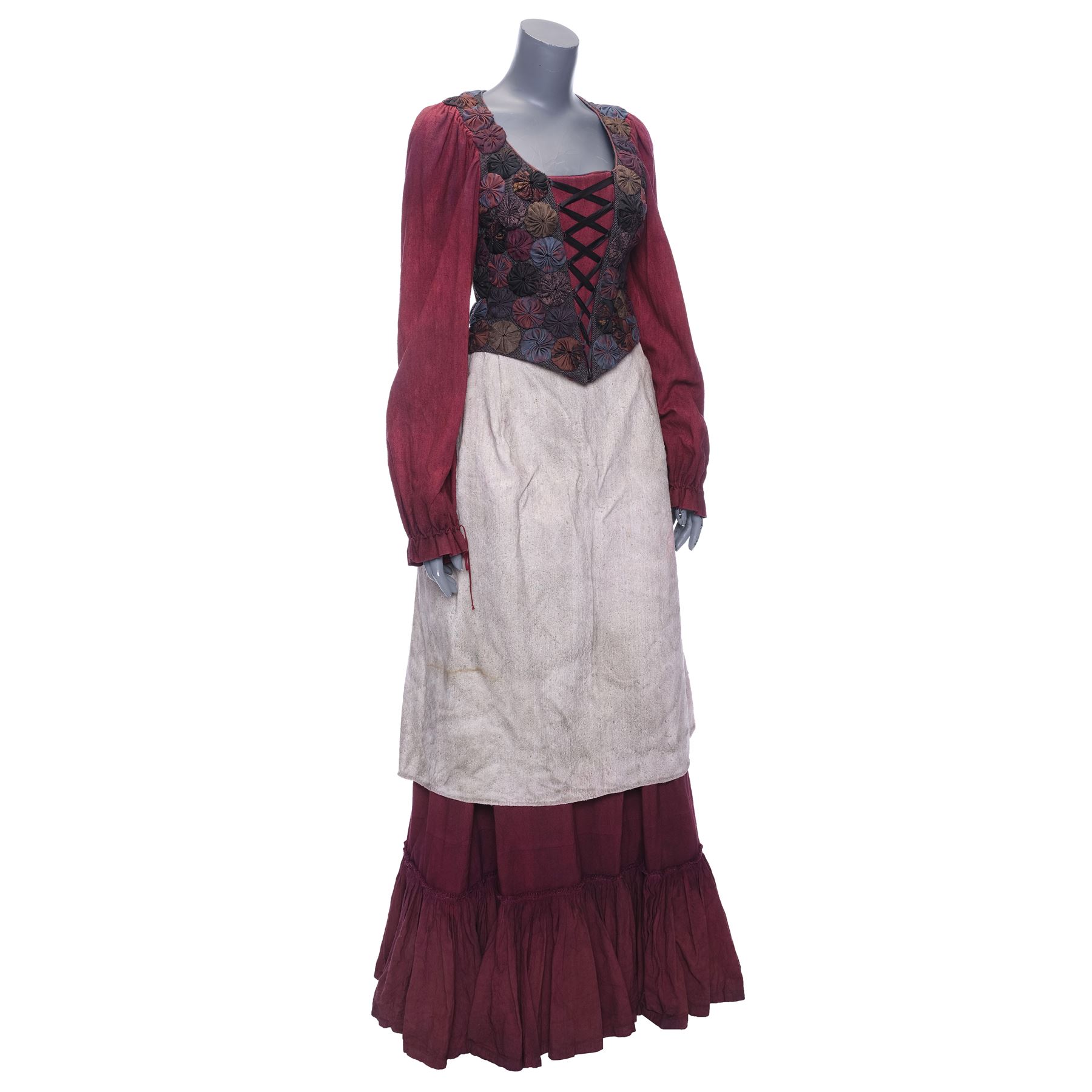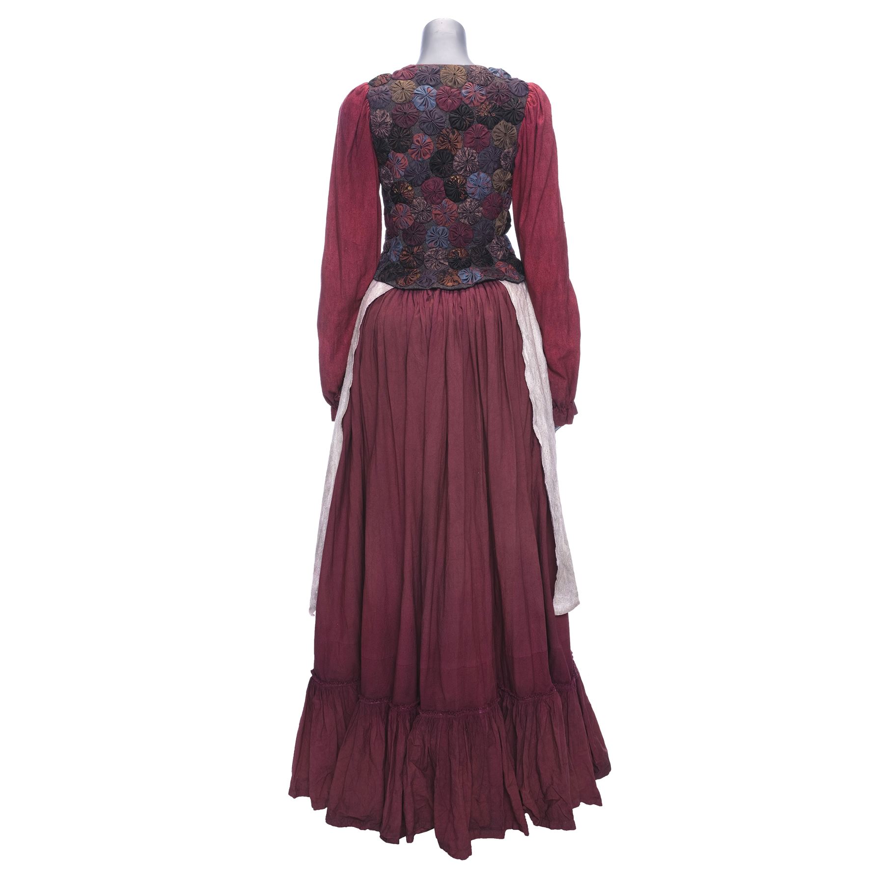 The costume consists of a built-in bodice with maroon textured cotton sleeves with a ribbon-laced front; a full-length matching maroon skirt layered with an attached black underskirt featuring a ruffled hem; and a cream-colored linen apron with "SM" printed on an upper corner. Multiple gathered fabric circles decorate the bodice and can be matched to several scenes where Lamia appears as the innkeeper's wife. Attached within the skirt is a padded bum roll which adds fullness to the back. This costume exhibits discoloration on the apron and minor wear to some of the stitching, while a small section of fraying is present on the back neckline of the bodice.