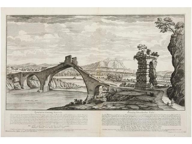 1750 ca., GRABADO: (MONTSERRAT),. PFEFFEL; ENGELBRECHT:, PONT DEL DIABLE EN MARTORELL CON VISTAS DE MONTSERRAT., A partir del dibujo de MATTHIAS ANTONIUS WEIS. Bello grabado al cobre de 43 x 65 cm. plancha; 49 x 71,5 cm. papel. Buen estado de conservación.