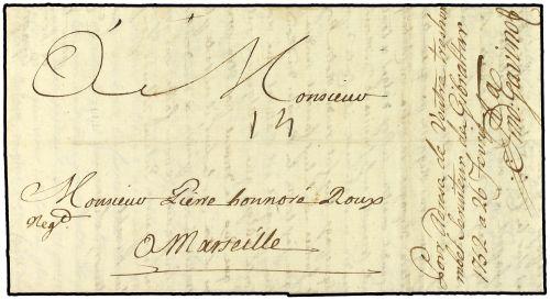 1752 GIBRALTAR a MARSELLA. Encaminada, manuscrito al dorso "Poor Adrese de voutre treshombel serviteur de Gibraltar" y firma "Gavino". MAGNIFICA y MUY RARA.