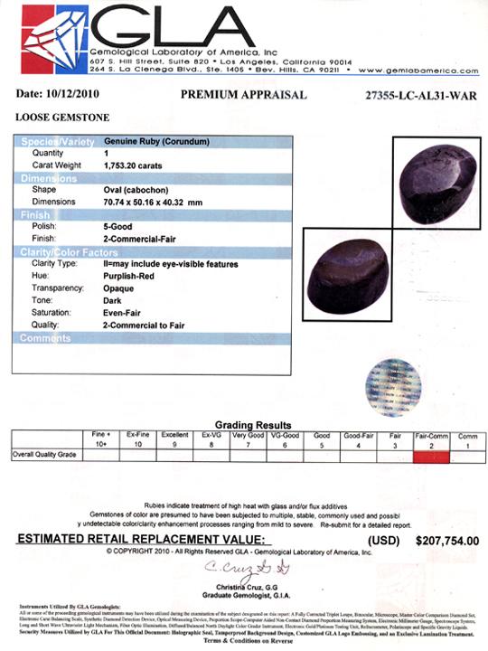 Excellent red purple colored specimen cabochon cut; lab quality evaluation 2; treatment as noted; Gem Guide wholesale $26298-$52596; full retail appraisal $207754; full lab evaluation included