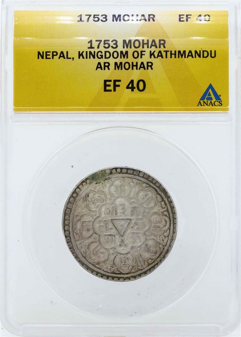 One 1753 Nepal Mohar Kingdom of Kathmandu Coin ANACS EF40. ANACS Appraised.