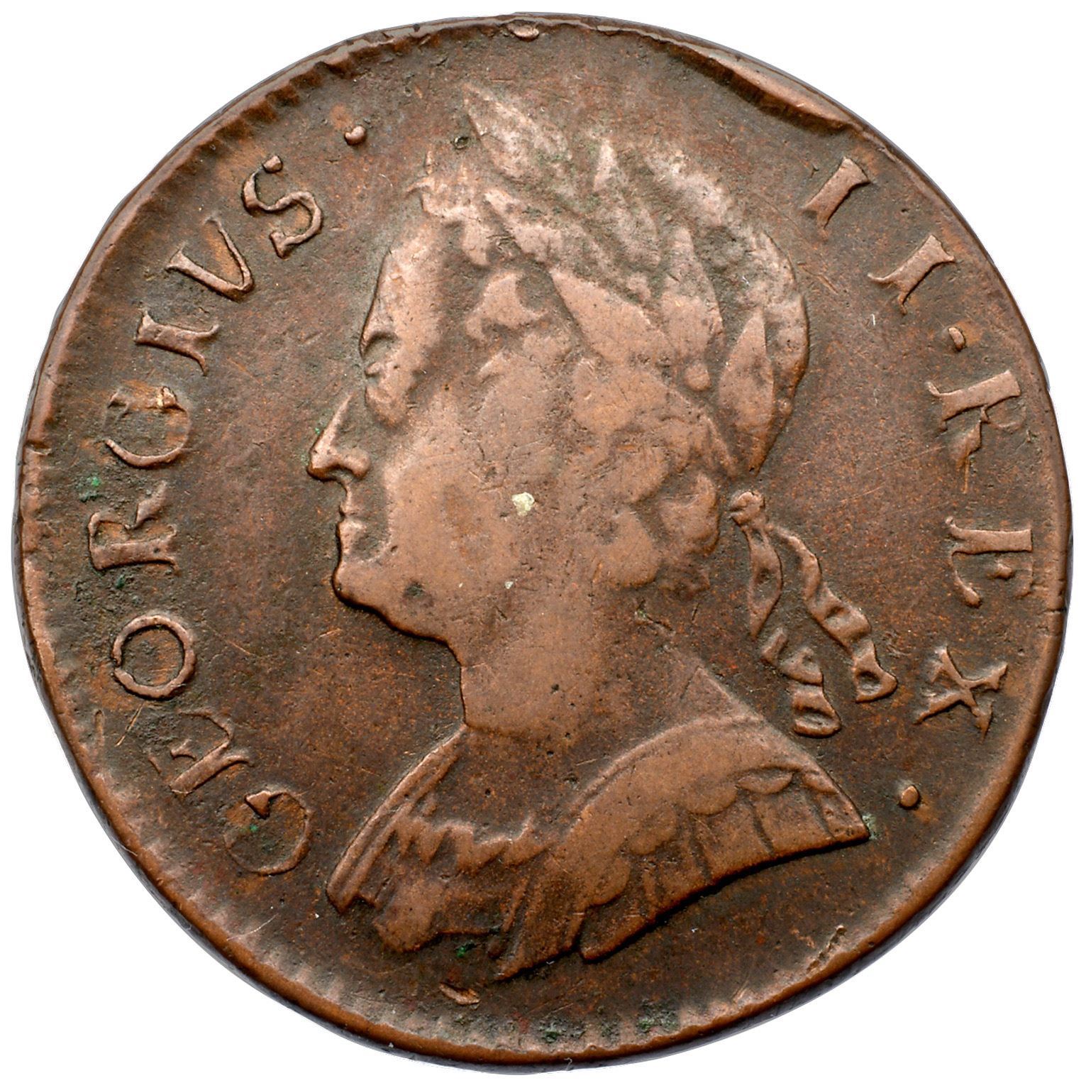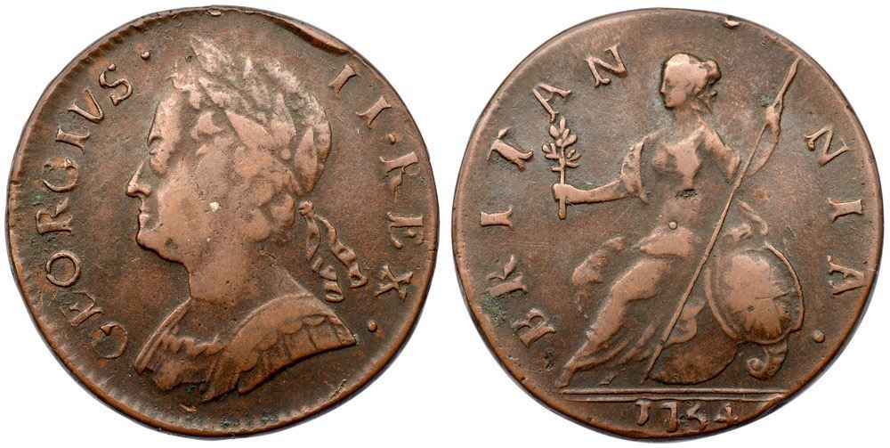 1754 Counterfeit George II Halfpenny. 165.2 grains.Choice Very Fine, struck on an amazingly thick planchet – one that actually weighs MORE than a regal halfpence of George II. Bold legends and date, and sharp design detail, cleanly circulated. The reverse is distinct in showing a large raised centering dot, where a compass was used to lay out the legends, but now gives Britannia an “outie†belly button. Pleasing light brown, typical small marks from circulation but nothing too detracting. From a family that is known but has not been published (only a couple George II families were done in the first book). The weight suggests this may have been made early – and though it is heavier than a regal coin, it would have still made a profit for the counterfeiter since it contained just over a farthing’s worth of actual copper. This is likely part of a larger family, many dated 1754, that tend to weigh over 120 grains, a group that includes the coin in the following lot.From the 1995 C4 sale, where this was Lot 569 (and there with a weight of 164.9 grains); no lot ticket from that sale, but easily plate matched.