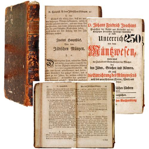 <Our item number 141038><B>1754 Printed Scholarly Study on "Jewish Coins".</B> Perhaps the earliest study on early Jewish Coins, by Johann Friedrich Joachim, the full title reads: "Unterricht von dem Münzwesen: worin sowol der Zustand und Beschaffenheit der Münzen bei den Jüden, Griechen und Römern, als auch die Einrichtung des Münzwesens nebst den unterschiedenen Sorten, Werth und Gehalt der Münzen in den vornehmsten Europäischen Ländern vorgestellt wird." Published at Halle in Magdeburg, 1754, 6¾ x 4 in., 288 pages plus a 12 page introduction and a 23 page Glossary and Index. Original 18th century boards, some of which are warping; the spine is worn, and there are name stamps from previous owners. The binding is intact and the pages are tight and clean. This work mostly covers the medieval coins of northern Europe, but it begins with chapters on ancient Greek, Roman and Jewish coinage. The chapter "Münzen bei den Jüden", fills pages 21 through 31, and may be the earliest printed scholarly treatment of Jewish coinage. The text is German throughout, aside from quotations of coin inscriptions. An old, woodblock printed bookplate has detached from the inside of the front cover. <BR>Estimated Value $300 - 600. <BR><BR>Our item number 141038<BR><IMAGES><P ALIGN="CENTER"><IMG SRC="http://www.goldbergcoins.net/liveauction/49jpegs/141038.jpg"> </P></IMAGES>