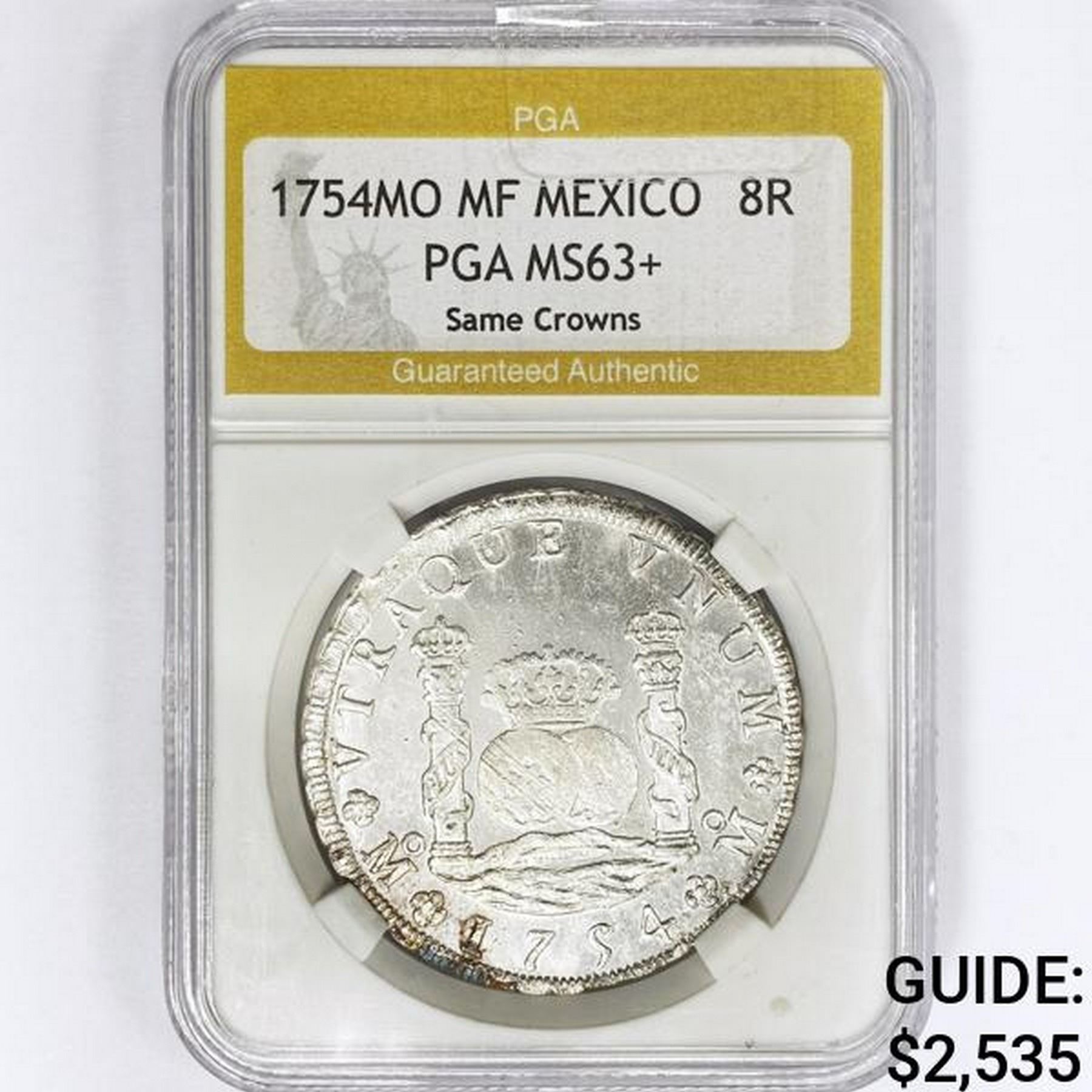 1754MO MF Mexico 8 Reales PGA MS63+ Same Crowns
