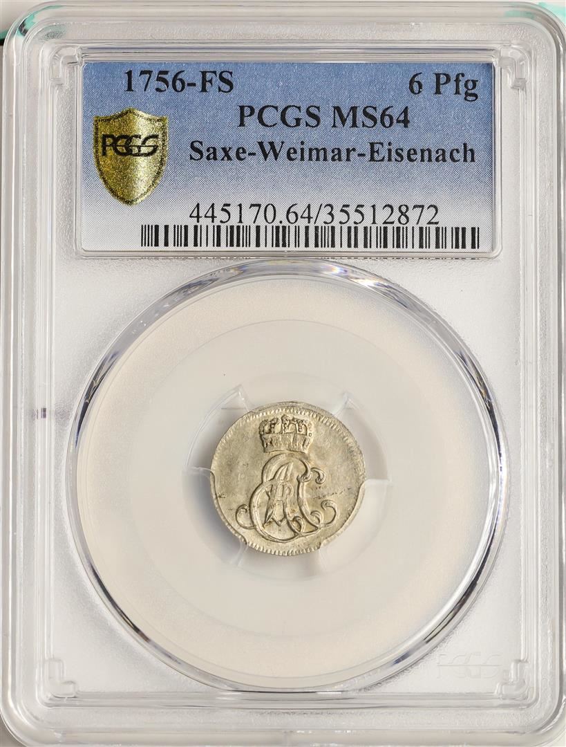 One 1756-FS Saxe-Weimar-Eisenach 6 Pfennig Coin PCGS MS64. PCGS Certified.
