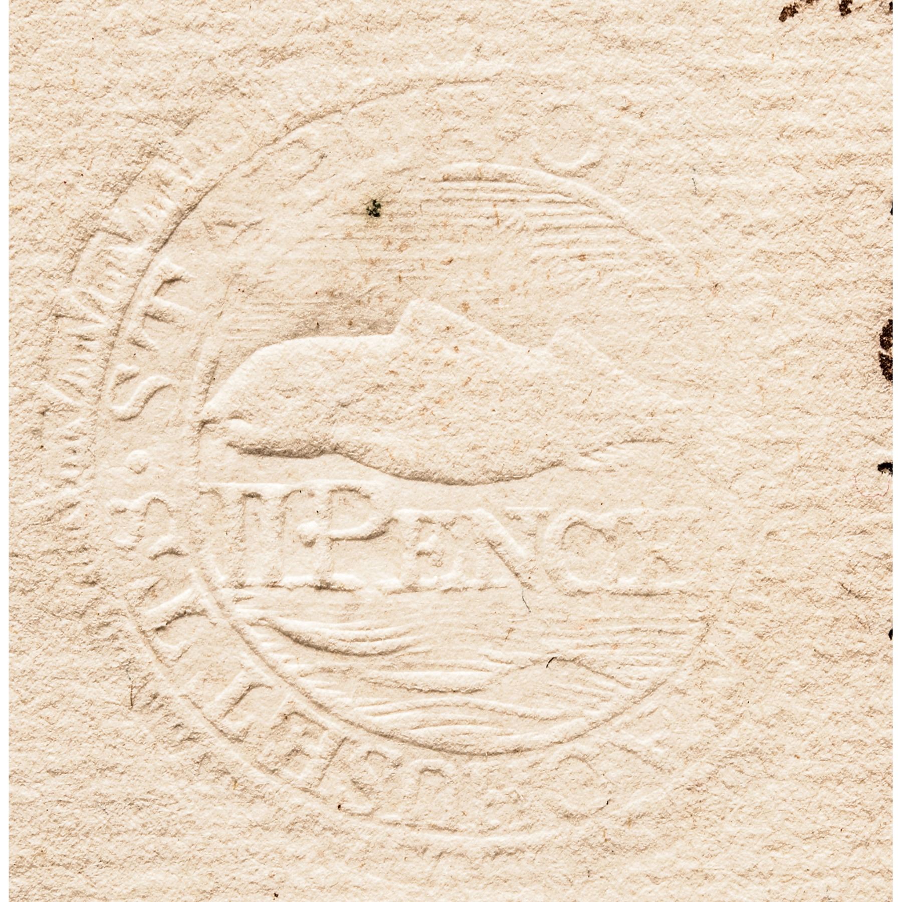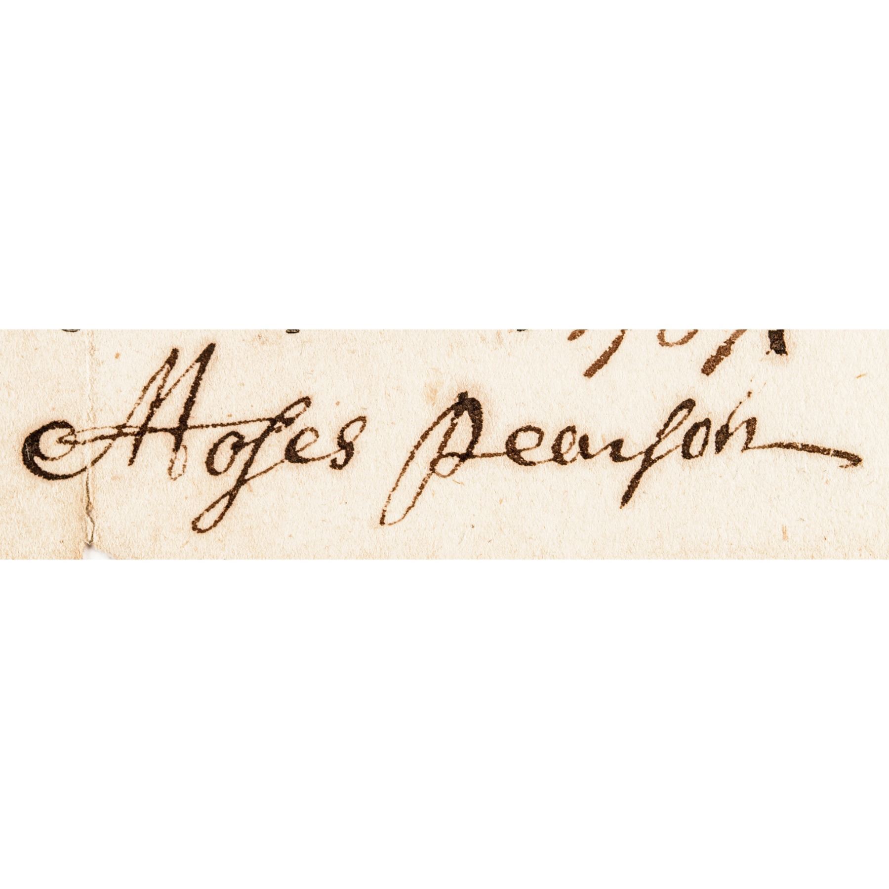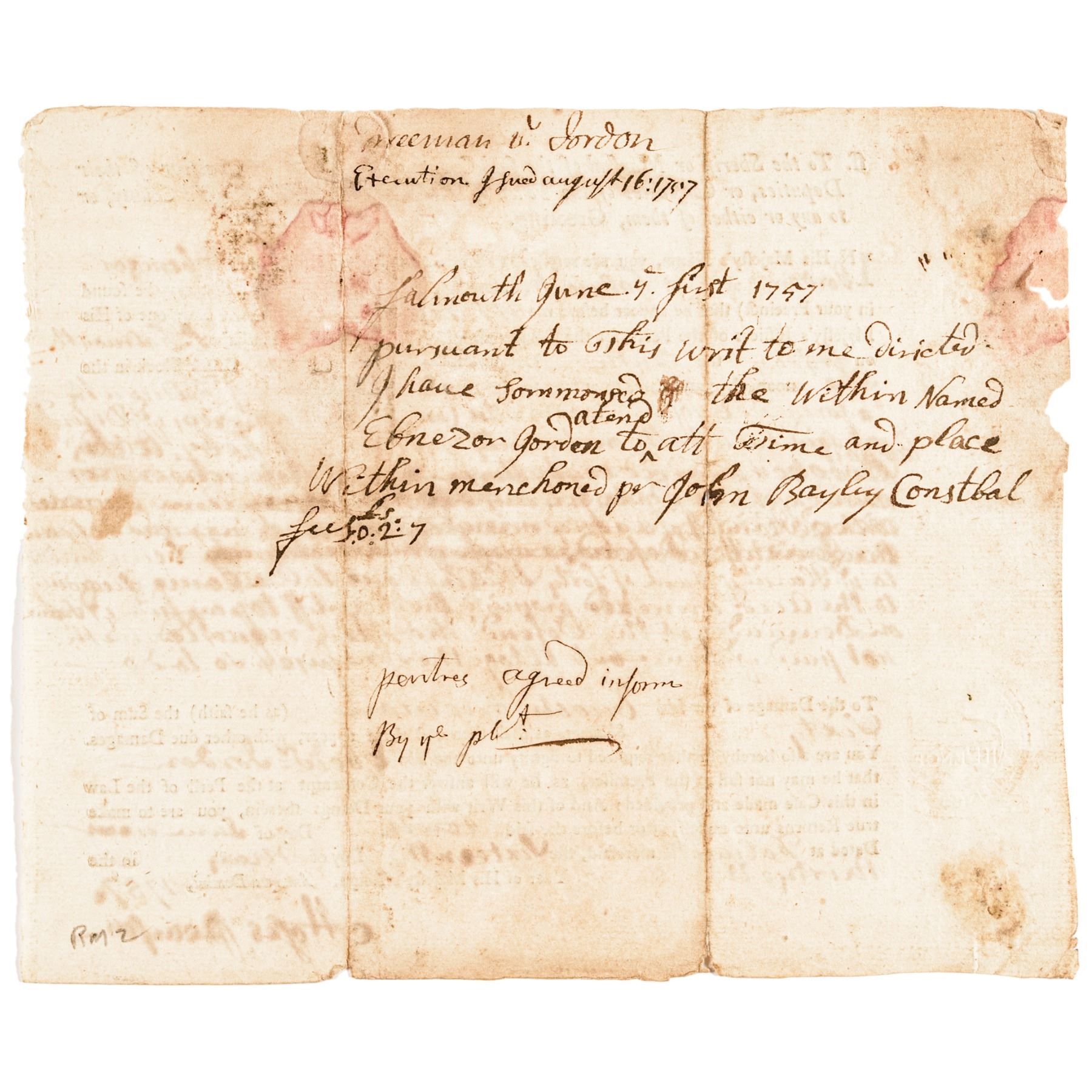 May 30, 1757-Dated, Partly-Printed Document, 6.25” x 7.5”, 1 page, York / Falmouth, (ME). with 2p Massachusetts (RM2), clear embossing though somewhat weak at its right side, located at lower left of part-printed Bond dated 1757. This Document reads: “In His Majesty’s Name, you are required to Summon and give Notice unto Ebenezer Gordon of Falmouth aforesaid, Yeoman (if he may be found in your Precinct) that he appear before me Moses Pearson Esq; one of His Majesty’s Justices of the Peace...”. Tone, folds, red wax seal with some transfer when folded yet visually appealing. The Moses Pearson signing this Document, is likely Capt. Moses Pearson who participated in the 1745 Siege of Louisbourg on Cape Breton Island, and who later founded the township of Pearsontown Plantation (now Standish), Maine.