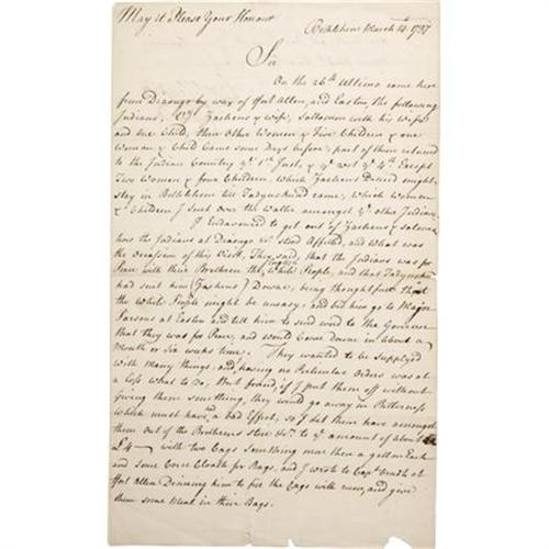 <B>1757 Timothy Horsfield Autograph Letter With Pennsylvania Indian Content.</B></I> One page, 7.5” x 12”, Bethlehem, March 14, 1757, to Governor William Denny, integral address leaf. Timothy Horsfield had ample experience in dealing the indigenous Indian tribes in the Moravian heartland of Pennsylvania. As justice of the peace for Northampton county, one his jobs was to protect white settlers and Christian Indians. In this letter he writes about a band of Indian men, women, and children sent by Chief Teedyuscung of the Delaware tribe to assure the white settlers they were for peace. A most interesting letter with excellent early Pennsylvania content. The paper has uniformly toned, the usual fold creases are present, with several areas of loss at the margins not affecting text, almost detached at the fold, else good condition. <I>Ex. Henry E. Luhrs Collection.</B></I> <BR><BR><b>Shipping:</b> Flat Material, Small (<a target="_blank" href="http://www.heritageauctions.com/common/shipping.php">view shipping information</a>)