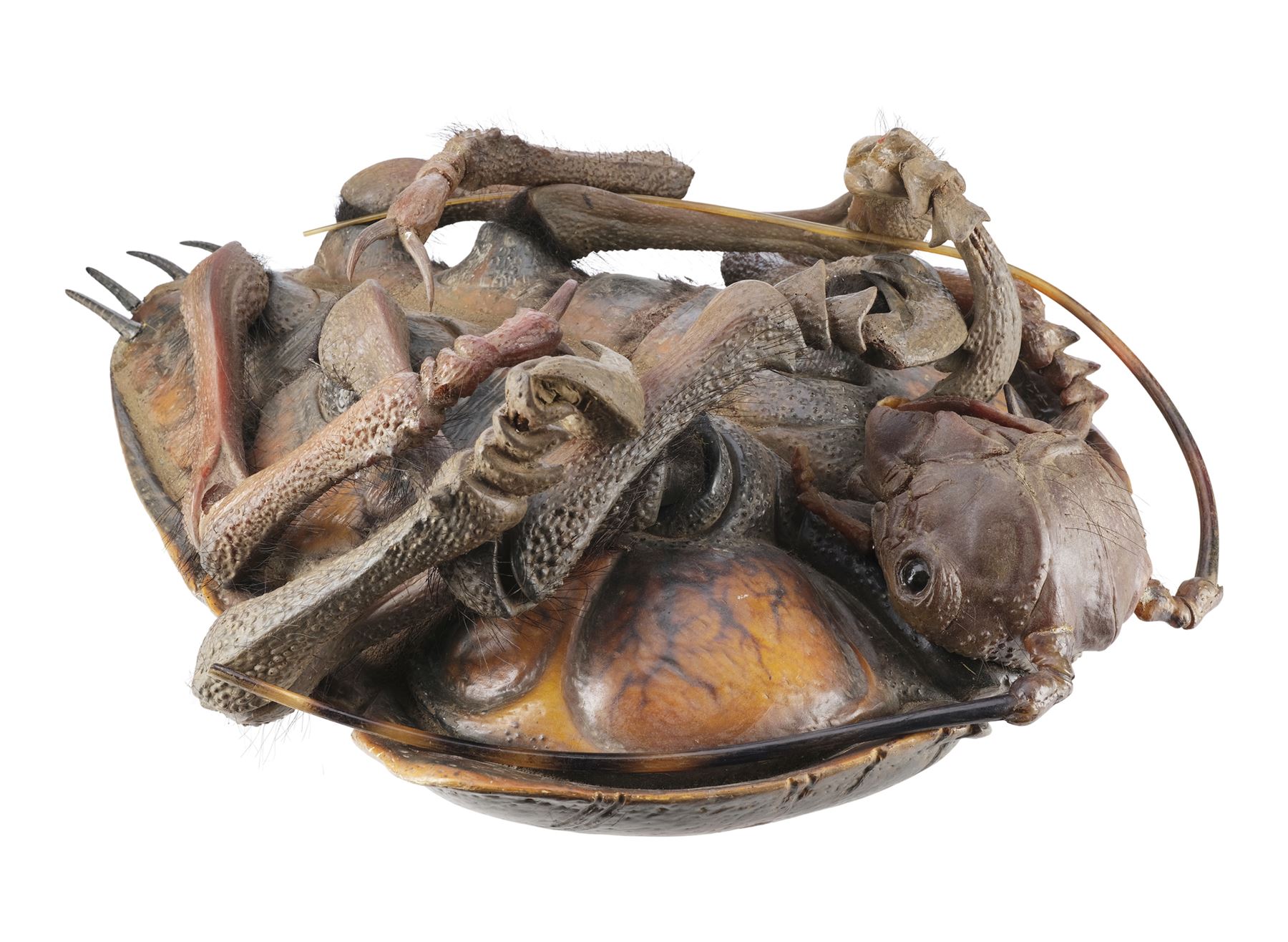 Designed and constructed by Academy Award& reg;-winning special effects group Amalgamated Dynamics, Inc. (ADI), this ornately detailed, full-size extraterrestrial bug originated from the collection of producer Jon Davison. It features a resin and foam abdominal shell cast around an internal metal armature and is inset with a rubber head and limbs. Synthetic black hairs are hand-punched to the legs, while rubber antennae extend from the head. The body is painted in various shades of brown with black striping, most visibly on the underside. The beetle exhibits loosening to several of its limbs, as well as grime and scratching from production use. Dimensions: 36" x 26" x 15" (91.5 cm x 66 cm x 38.25 cm)