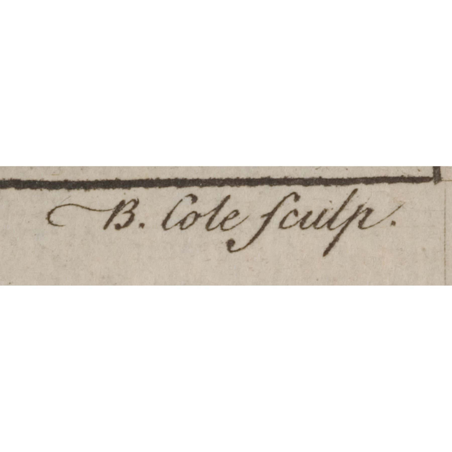 This Engraved Print on laid period paper measures 7.5” x 11.25”, by “B. Cole, sculp(tor),” likely British and an illustration from a book showing a Period, French and Indian War Era fort, flying its two flags. In 1757 a British fleet attacked the Ile d'Aix. The firepower of cannon had increased since the 17th century and the fort was heavily damaged after an hour's bombardment. The British landed on the island, plundered and burned the village and slighted the fortifications. This incident demonstrated the need for change in fortification methods to resist more powerful artillery.