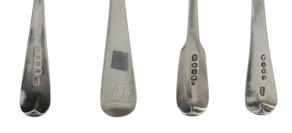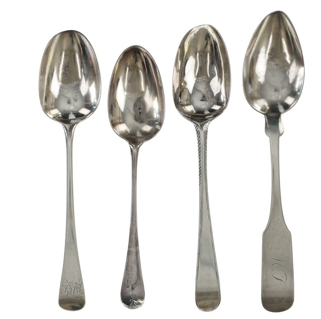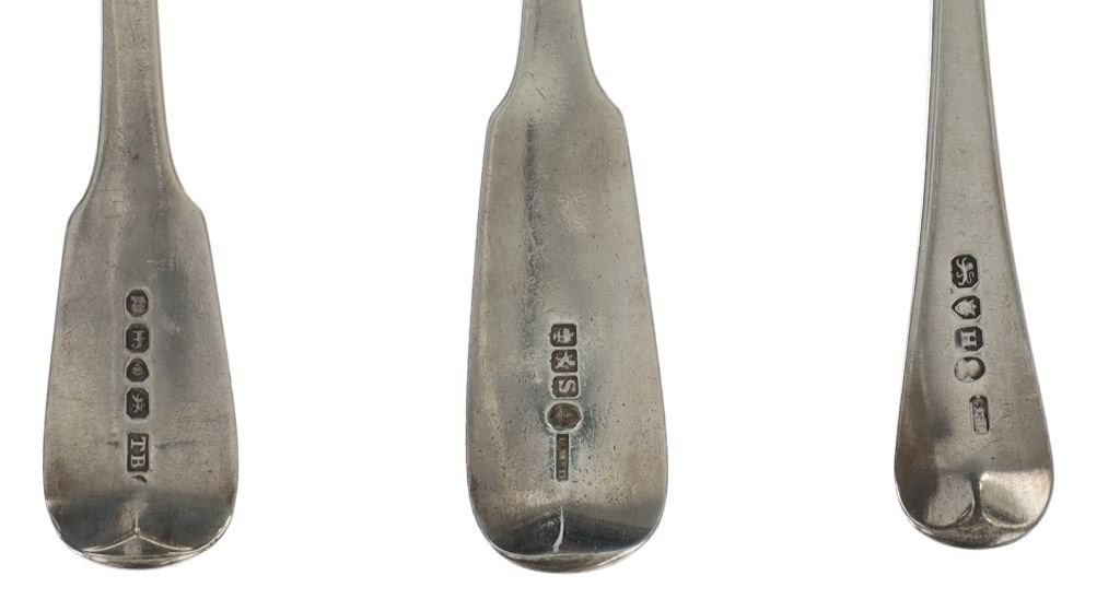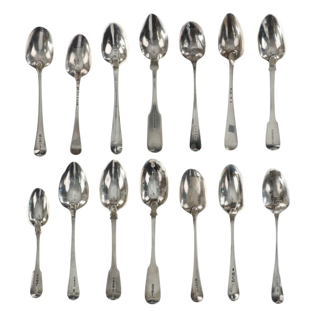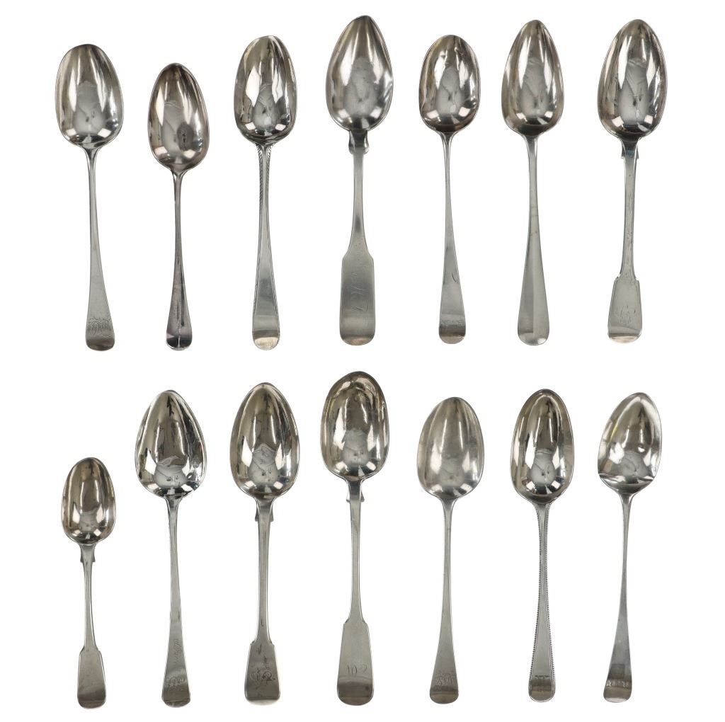 For your consideration are fourteen sterling spoons made in England circa 1759-1837. The first spoon in this collection was made by Orlando Jackson in London circa 1772. James Young entered into a partnership with Orlando Jackson on the 17th of March 1774. Orlando Jackson has no record of apprenticeship or freedom however his first mark is entered in 1759. The spoon features a sterling construction and shows the makers mark and respective stamps on the back of the neck with the makers mark reading "IO". The next stamp is a lion passant indicating the quality of the sterling, followed by the London town mark and lastly a letter "R" indicating the year it was made (1772). The back of the handle shows initials as well reading "TH". The second spoon in this collection was made by David McDonald in Glasgow, Scotland circa 1837. The spoon features a sterling construction and shows initials on the top of the handle. The bottom of the neck shows the makers marks reading "D. McD" with a right facing kings head showing it was made under King William IV rule, an "S" indicating the year it was made (1837), a lion passant indicating the quality of the silver, and the Glasgow town mark. The third spoon in this collection was made by Bliss & Whittemore circa 1880-1900s. The spoon features a sterling construction and shows initials on the top of the handle reading, "MJ". The bottom of the handle shows the makers mark reading, "Bliss & Whittemore". The fourth spoon in this collection features a sterling construction and shows English stamps on the back of the neck along with the unidentified makers mark. The stamps show the makers mark reading, "VH 8", a lion passant indicating the quality of the silver, and left facing queens head and the letter "b" indicating the year it was made. The back of the handle reads "N=33". The fifth spoon in this collection shows no makers marks or stamps but features a sterling construction and small stamped designs on the outer edge of the the handle and neck. The sixth spoon in this collection was made by Thomas Wilkes Barker in London circa 1821. Thomas was the son of Christopher Barker of Pemberton Row, Gough Square, London Silversmith. The spoon shows initials on the handle reading, "GJ" while the back of the handle shows the makers mark and respective stamps. The makers mark reads, "TB", followed by a lion passant indicating the quality of the silver, the London town mark, the letter "f" showing what year it was made (1821) and a right facing kings head indicating it was made under King George IV. The seventh spoon in this collection was made by Richard Rugg in London circa 1790. The spoon shows initials on the top of the handle reading, "JJJ" and a name on the neck reading, "S. Parrott". The back of the spoon shows the makers mark reading "RR", a lion passant indicating the quality of the silver, the London town mark, the letter "P" showing what year it was made (1790) and a right facing kings head indicating it was made under King George III rule. The eighth spoon in this lot was made by Thomas Dicks in London circa 1803. The spoon features a sterling construction and shows stamped initials on the handle reading, "WHG" with the makers mark and other stamps on the back of the handle. The makers mark reads "TD", followed by a right facing kings head indicating it was made under King George III, the letter "H" showing the year it was made (1803), the London town mark and a lion passant indicating the quality of the silver. The ninth spoon in this collection was made by George Gray in London circa 1792. The spoon features a sterling construction and shows stamped initials on the top of the handle reading "R.R". The back of the handle shows stampings including the makers mark reading "GG" along with a right facing kings head indicating it was made under King George III, the letter "r" indicating it was made in the year 1792, the London town mar and a lion passant indicating the quality of the silver. The spoon shows a cut in the bowl. The tenth spoon in this collection was made by George Smith in London circa 1784. George Smith III was apprenticed to Thomas Chawner in 1765. The spoon featured initials on the handle at some point but has since been worn down. The back of the handle shows the respective stamps such as the makers mark reading "GS" in script, the London town mark, a lion passant indicating the quality of the silver and the letter "i" indicating the year it was made (1784). The handle shows a simple stamped design on the outer edge. The eleventh spoon in this collection was made by Thomas W. Barker in London circa 1821. The spoon features a sterling construction and shows initials stamped on the handle reading, "GJ". The back of the handle shows the makers mark and other stampings. The makers marks reads "TB" while the other stampings include a lion passant indicating the quality of the silver, the London town mark, the letter "f" showing what year it was made (1821) and a right facing kings head showing it was made under King George IV. The twelfth spoon in this collection was also made by Thomas Dicks in London circa 1803. The spoon features a sterling construction and shows stamped initials on the handle reading, "WHG" with the makers mark and other stamps on the back of the handle. The makers mark reads "TD", followed by a right facing kings head indicating it was made under King George III, the letter "H" showing the year it was made (1803), the London town mark and a lion passant indicating the quality of the silver. The thirteenth spoon in this collection was made by George Gray in London circa 1792. The spoon features a sterling construction and shows stamped initials on the top of the handle reading "R.R". The back of the handle shows stampings including the makers mark reading "GG" along with a right facing kings head indicating it was made under King George III, the letter "r" indicating it was made in the year 1792, the London town mark and a lion