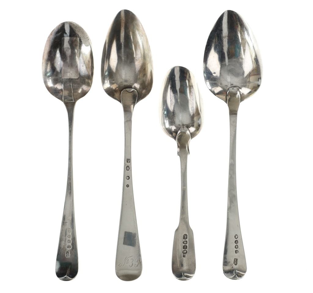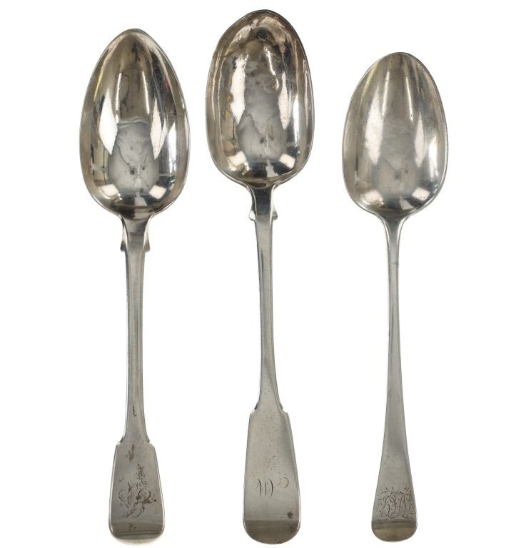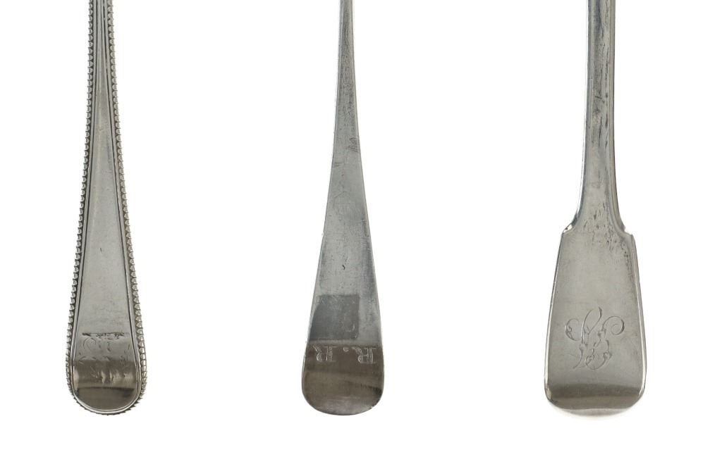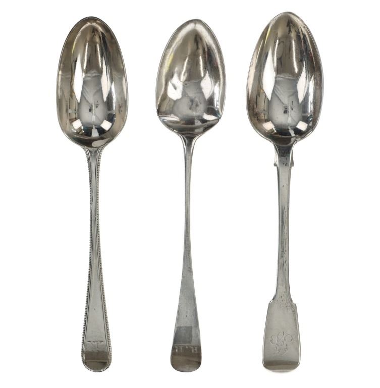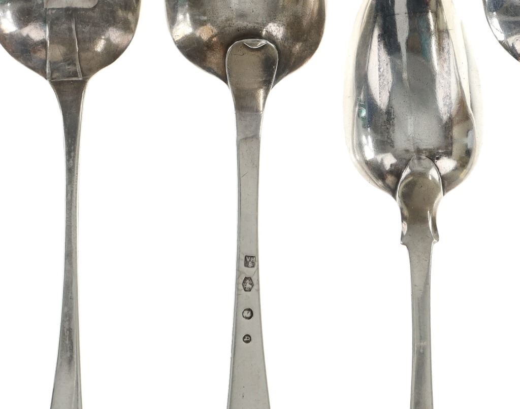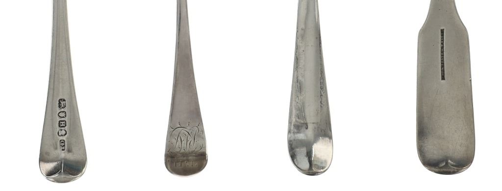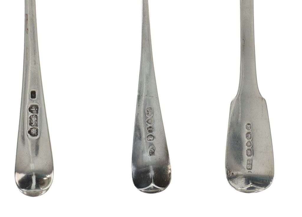 For your consideration are fourteen sterling spoons made in England circa 1759-1837. The first spoon in this collection was made by Orlando Jackson in London circa 1772. James Young entered into a partnership with Orlando Jackson on the 17th of March 1774. Orlando Jackson has no record of apprenticeship or freedom however his first mark is entered in 1759. The spoon features a sterling construction and shows the makers mark and respective stamps on the back of the neck with the makers mark reading "IO". The next stamp is a lion passant indicating the quality of the sterling, followed by the London town mark and lastly a letter "R" indicating the year it was made (1772). The back of the handle shows initials as well reading "TH". The second spoon in this collection was made by David McDonald in Glasgow, Scotland circa 1837. The spoon features a sterling construction and shows initials on the top of the handle. The bottom of the neck shows the makers marks reading "D. McD" with a right facing kings head showing it was made under King William IV rule, an "S" indicating the year it was made (1837), a lion passant indicating the quality of the silver, and the Glasgow town mark. The third spoon in this collection was made by Bliss & Whittemore circa 1880-1900s. The spoon features a sterling construction and shows initials on the top of the handle reading, "MJ". The bottom of the handle shows the makers mark reading, "Bliss & Whittemore". The fourth spoon in this collection features a sterling construction and shows English stamps on the back of the neck along with the unidentified makers mark. The stamps show the makers mark reading, "VH 8", a lion passant indicating the quality of the silver, and left facing queens head and the letter "b" indicating the year it was made. The back of the handle reads "N=33". The fifth spoon in this collection shows no makers marks or stamps but features a sterling construction and small stamped designs on the outer edge of the the handle and neck. The sixth spoon in this collection was made by Thomas Wilkes Barker in London circa 1821. Thomas was the son of Christopher Barker of Pemberton Row, Gough Square, London Silversmith. The spoon shows initials on the handle reading, "GJ" while the back of the handle shows the makers mark and respective stamps. The makers mark reads, "TB", followed by a lion passant indicating the quality of the silver, the London town mark, the letter "f" showing what year it was made (1821) and a right facing kings head indicating it was made under King George IV. The seventh spoon in this collection was made by Richard Rugg in London circa 1790. The spoon shows initials on the top of the handle reading, "JJJ" and a name on the neck reading, "S. Parrott". The back of the spoon shows the makers mark reading "RR", a lion passant indicating the quality of the silver, the London town mark, the letter "P" showing what year it was made (1790) and a right facing kings head indicating it was made under King George III rule. The eighth spoon in this lot was made by Thomas Dicks in London circa 1803. The spoon features a sterling construction and shows stamped initials on the handle reading, "WHG" with the makers mark and other stamps on the back of the handle. The makers mark reads "TD", followed by a right facing kings head indicating it was made under King George III, the letter "H" showing the year it was made (1803), the London town mark and a lion passant indicating the quality of the silver. The ninth spoon in this collection was made by George Gray in London circa 1792. The spoon features a sterling construction and shows stamped initials on the top of the handle reading "R.R". The back of the handle shows stampings including the makers mark reading "GG" along with a right facing kings head indicating it was made under King George III, the letter "r" indicating it was made in the year 1792, the London town mar and a lion passant indicating the quality of the silver. The spoon shows a cut in the bowl. The tenth spoon in this collection was made by George Smith in London circa 1784. George Smith III was apprenticed to Thomas Chawner in 1765. The spoon featured initials on the handle at some point but has since been worn down. The back of the handle shows the respective stamps such as the makers mark reading "GS" in script, the London town mark, a lion passant indicating the quality of the silver and the letter "i" indicating the year it was made (1784). The handle shows a simple stamped design on the outer edge. The eleventh spoon in this collection was made by Thomas W. Barker in London circa 1821. The spoon features a sterling construction and shows initials stamped on the handle reading, "GJ". The back of the handle shows the makers mark and other stampings. The makers marks reads "TB" while the other stampings include a lion passant indicating the quality of the silver, the London town mark, the letter "f" showing what year it was made (1821) and a right facing kings head showing it was made under King George IV. The twelfth spoon in this collection was also made by Thomas Dicks in London circa 1803. The spoon features a sterling construction and shows stamped initials on the handle reading, "WHG" with the makers mark and other stamps on the back of the handle. The makers mark reads "TD", followed by a right facing kings head indicating it was made under King George III, the letter "H" showing the year it was made (1803), the London town mark and a lion passant indicating the quality of the silver. The thirteenth spoon in this collection was made by George Gray in London circa 1792. The spoon features a sterling construction and shows stamped initials on the top of the handle reading "R.R". The back of the handle shows stampings including the makers mark reading "GG" along with a right facing kings head indicating it was made under King George III, the letter "r" indicating it was made in the year 1792, the London town mark and a lion