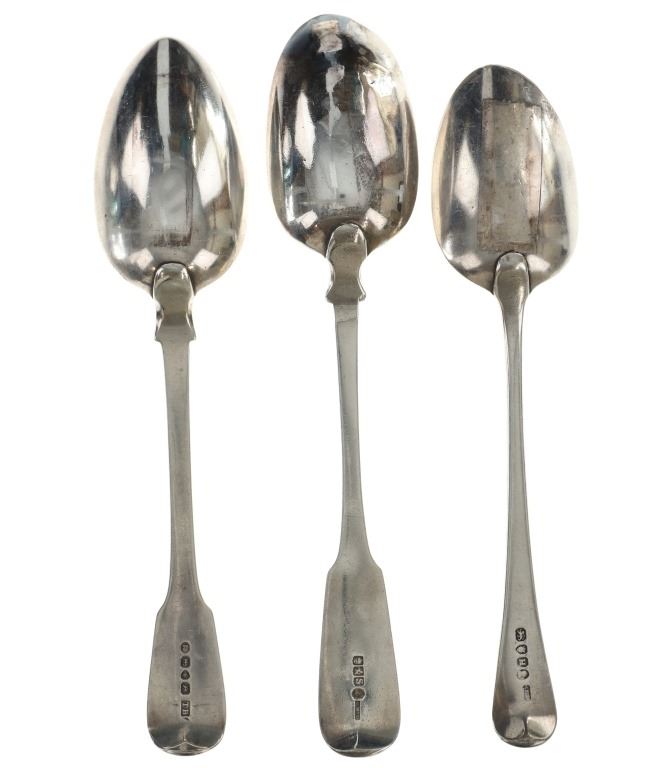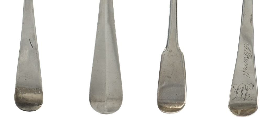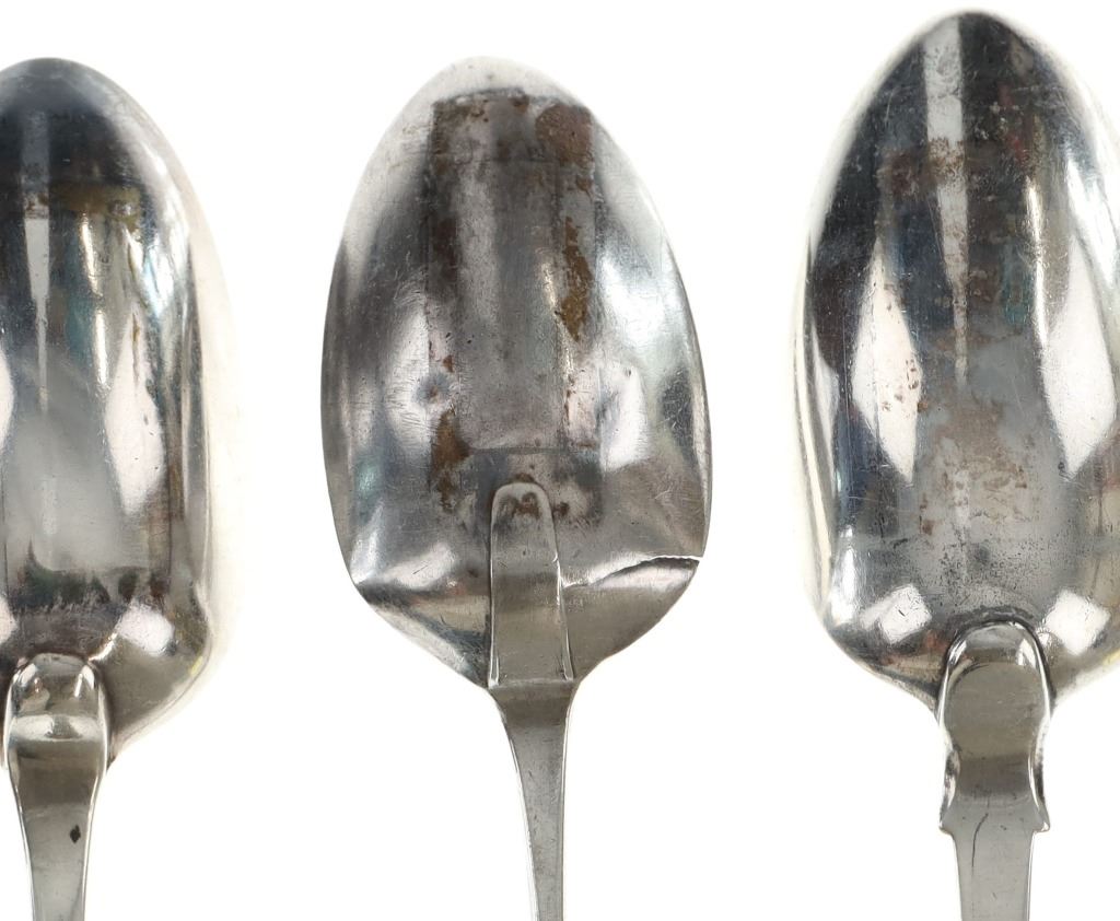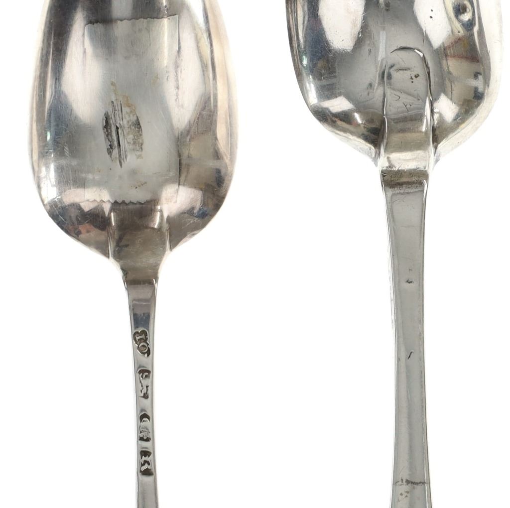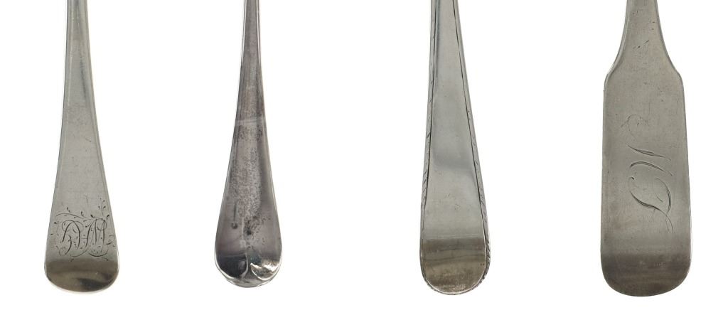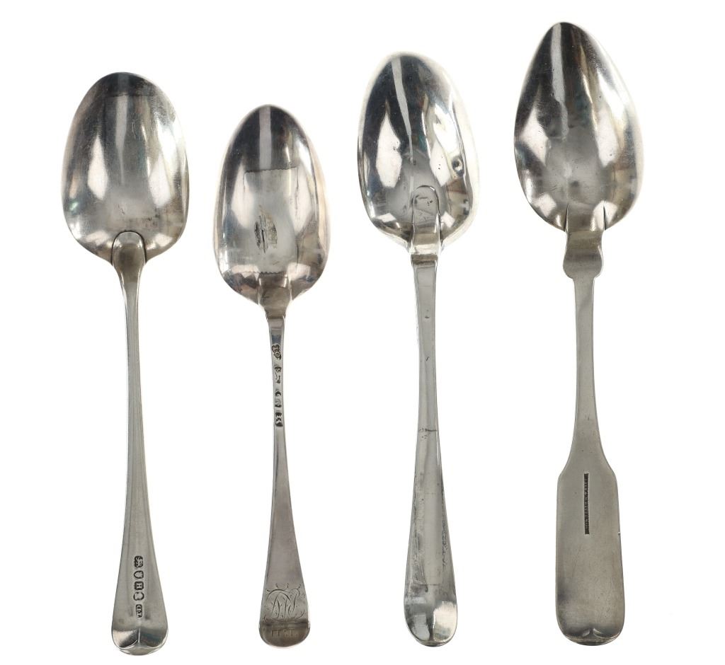 For your consideration are fourteen sterling spoons made in England circa 1759-1837. The first spoon in this collection was made by Orlando Jackson in London circa 1772. James Young entered into a partnership with Orlando Jackson on the 17th of March 1774. Orlando Jackson has no record of apprenticeship or freedom however his first mark is entered in 1759. The spoon features a sterling construction and shows the makers mark and respective stamps on the back of the neck with the makers mark reading "IO". The next stamp is a lion passant indicating the quality of the sterling, followed by the London town mark and lastly a letter "R" indicating the year it was made (1772). The back of the handle shows initials as well reading "TH". The second spoon in this collection was made by David McDonald in Glasgow, Scotland circa 1837. The spoon features a sterling construction and shows initials on the top of the handle. The bottom of the neck shows the makers marks reading "D. McD" with a right facing kings head showing it was made under King William IV rule, an "S" indicating the year it was made (1837), a lion passant indicating the quality of the silver, and the Glasgow town mark. The third spoon in this collection was made by Bliss & Whittemore circa 1880-1900s. The spoon features a sterling construction and shows initials on the top of the handle reading, "MJ". The bottom of the handle shows the makers mark reading, "Bliss & Whittemore". The fourth spoon in this collection features a sterling construction and shows English stamps on the back of the neck along with the unidentified makers mark. The stamps show the makers mark reading, "VH 8", a lion passant indicating the quality of the silver, and left facing queens head and the letter "b" indicating the year it was made. The back of the handle reads "N=33". The fifth spoon in this collection shows no makers marks or stamps but features a sterling construction and small stamped designs on the outer edge of the the handle and neck. The sixth spoon in this collection was made by Thomas Wilkes Barker in London circa 1821. Thomas was the son of Christopher Barker of Pemberton Row, Gough Square, London Silversmith. The spoon shows initials on the handle reading, "GJ" while the back of the handle shows the makers mark and respective stamps. The makers mark reads, "TB", followed by a lion passant indicating the quality of the silver, the London town mark, the letter "f" showing what year it was made (1821) and a right facing kings head indicating it was made under King George IV. The seventh spoon in this collection was made by Richard Rugg in London circa 1790. The spoon shows initials on the top of the handle reading, "JJJ" and a name on the neck reading, "S. Parrott". The back of the spoon shows the makers mark reading "RR", a lion passant indicating the quality of the silver, the London town mark, the letter "P" showing what year it was made (1790) and a right facing kings head indicating it was made under King George III rule. The eighth spoon in this lot was made by Thomas Dicks in London circa 1803. The spoon features a sterling construction and shows stamped initials on the handle reading, "WHG" with the makers mark and other stamps on the back of the handle. The makers mark reads "TD", followed by a right facing kings head indicating it was made under King George III, the letter "H" showing the year it was made (1803), the London town mark and a lion passant indicating the quality of the silver. The ninth spoon in this collection was made by George Gray in London circa 1792. The spoon features a sterling construction and shows stamped initials on the top of the handle reading "R.R". The back of the handle shows stampings including the makers mark reading "GG" along with a right facing kings head indicating it was made under King George III, the letter "r" indicating it was made in the year 1792, the London town mar and a lion passant indicating the quality of the silver. The spoon shows a cut in the bowl. The tenth spoon in this collection was made by George Smith in London circa 1784. George Smith III was apprenticed to Thomas Chawner in 1765. The spoon featured initials on the handle at some point but has since been worn down. The back of the handle shows the respective stamps such as the makers mark reading "GS" in script, the London town mark, a lion passant indicating the quality of the silver and the letter "i" indicating the year it was made (1784). The handle shows a simple stamped design on the outer edge. The eleventh spoon in this collection was made by Thomas W. Barker in London circa 1821. The spoon features a sterling construction and shows initials stamped on the handle reading, "GJ". The back of the handle shows the makers mark and other stampings. The makers marks reads "TB" while the other stampings include a lion passant indicating the quality of the silver, the London town mark, the letter "f" showing what year it was made (1821) and a right facing kings head showing it was made under King George IV. The twelfth spoon in this collection was also made by Thomas Dicks in London circa 1803. The spoon features a sterling construction and shows stamped initials on the handle reading, "WHG" with the makers mark and other stamps on the back of the handle. The makers mark reads "TD", followed by a right facing kings head indicating it was made under King George III, the letter "H" showing the year it was made (1803), the London town mark and a lion passant indicating the quality of the silver. The thirteenth spoon in this collection was made by George Gray in London circa 1792. The spoon features a sterling construction and shows stamped initials on the top of the handle reading "R.R". The back of the handle shows stampings including the makers mark reading "GG" along with a right facing kings head indicating it was made under King George III, the letter "r" indicating it was made in the year 1792, the London town mark and a lion