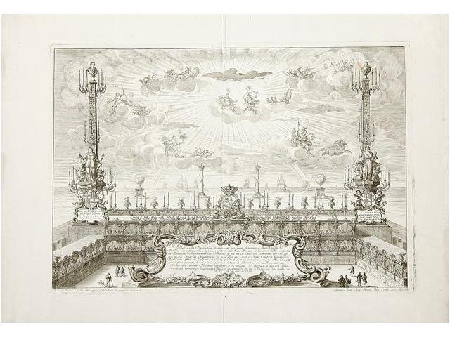 1759., GRABADO: CANALS, J.P.; VALLS, I.:, IDEA DE LA PERSPECTIVA ILUMINADA QUE PARA OBSEQUIAR A SUS MAGESTADES Y REAL FAMILIA, en su feliz arribo, erigieron en frente del Real Palacio, el Comercio i Real Compañia de Barcelona,. Bello grabado al cobre, 30,5 x 45 cm. Grabado por Valls según el dibujo de Canals. Cat. Soley 344.