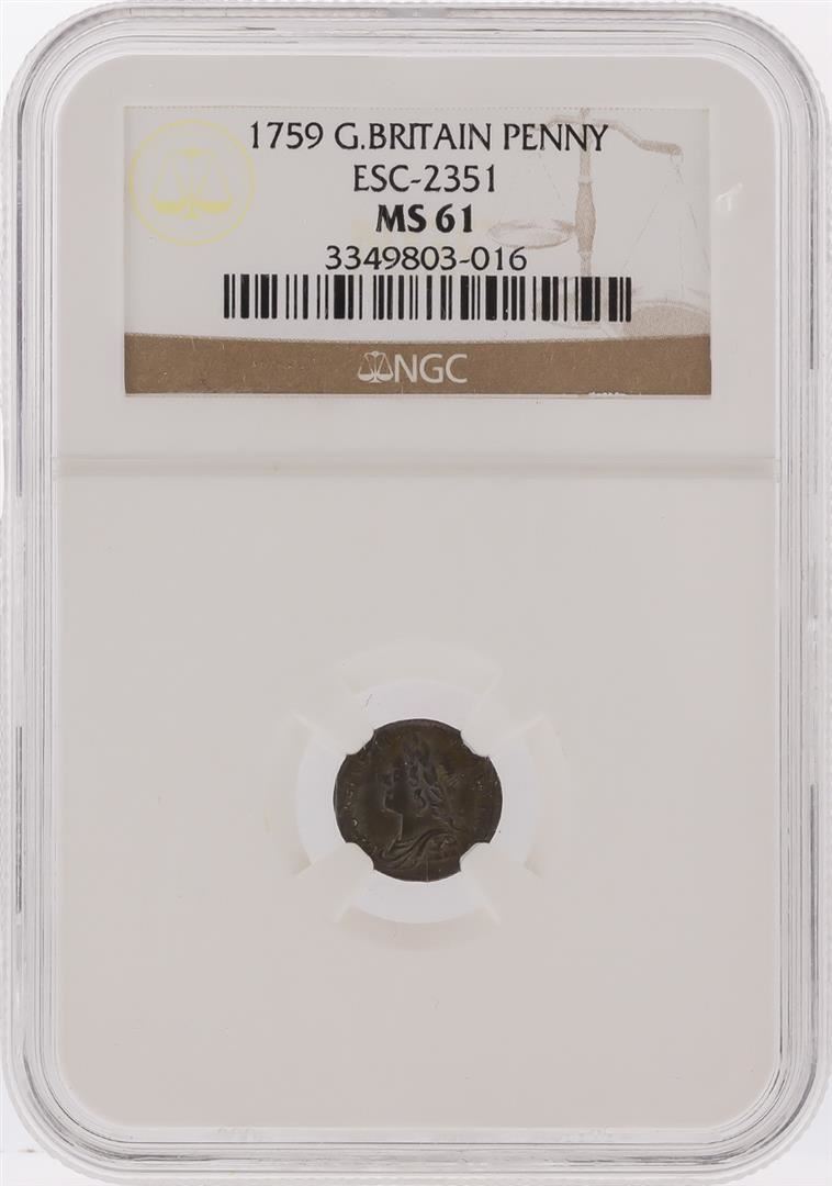 One 1759 Great Britain Penny ESC-2351 Coin NGC Graded MS61. NGC Certified.