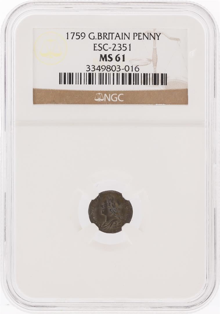 One 1759 Great Britain Penny ESC-2351 Coin NGC Graded MS61. NGC Certified.