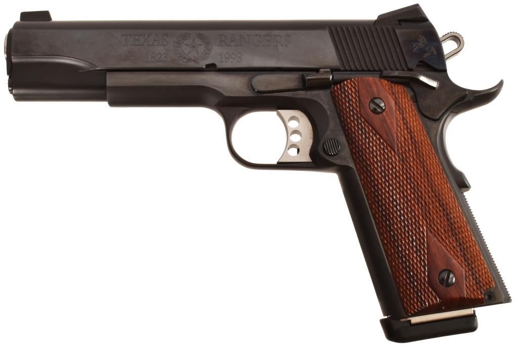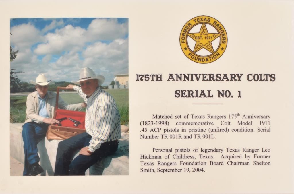 Serial no. 1 Colt 1911 175th Anniversary set exclusively available to Texas Rangers issued in order based upon seniority, not rank. This set was issued to the longest tenured Texas Ranger Leo Hickman in 1998. With documentation.