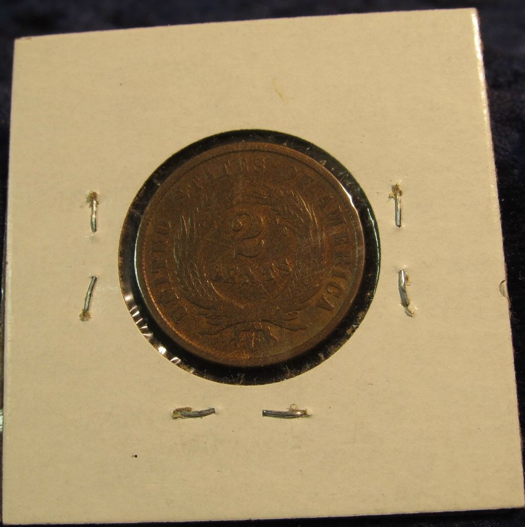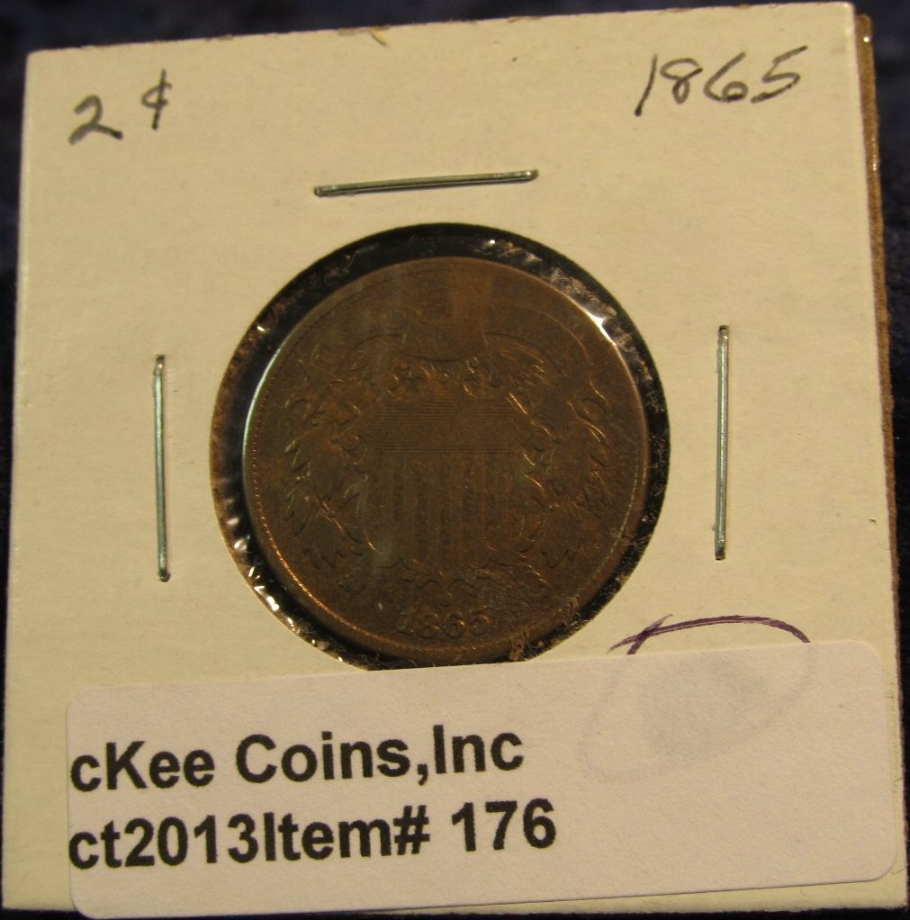 176. 1865 U.S. Two Cent Piece. VG-8. Redbook value $19.00.