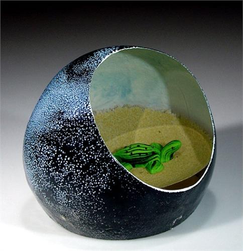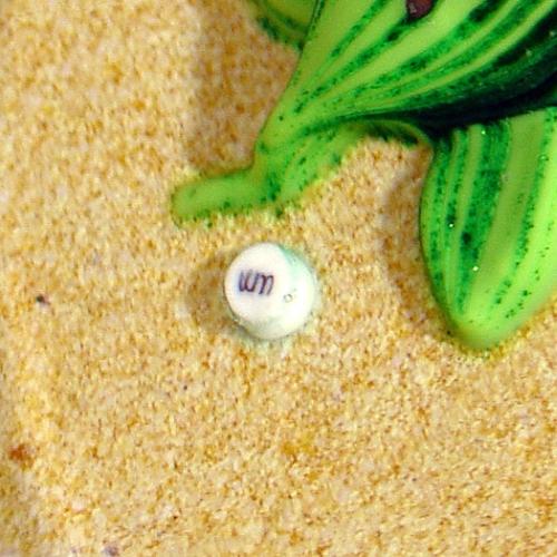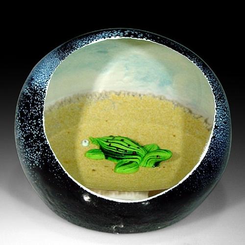 William Manson 1999 turtle upright paperweight, containing a black-spotted green turtle, moving slowly through the sand, inside a mottled black cave. Front window facet. Signature cane. Signed/dated. Edition # 4 of a limited edition of 50. Diameter 3 1/4". NO RESERVE