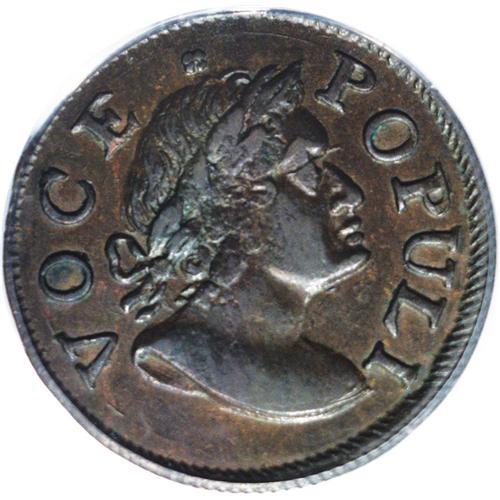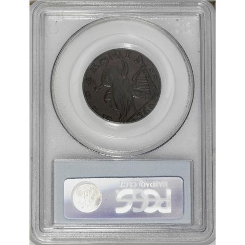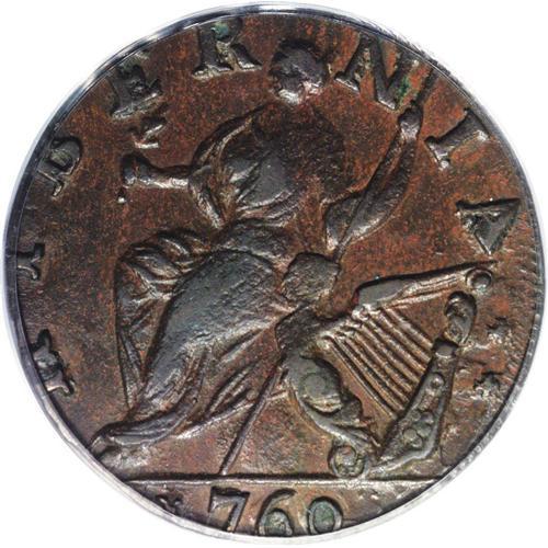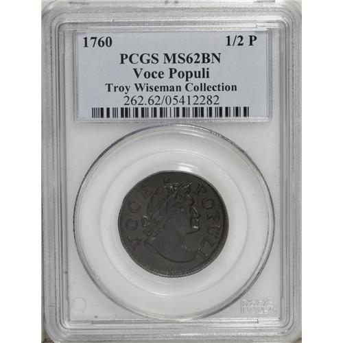 <B>1760 1/2P Hibernia-Voce Populi Halfpenny MS62 Brown PCGS.</B></I> Z. 6-C, N.9. A satiny and unabraded Voce Populi with original ebony and golden-brown toning. Although the device highpoints lack pinpoint sharpness, and the reverse is slightly misaligned toward 8 o'clock, the technical quality of the present piece is undisputable. Listed on page 47 of the 2007 <I>Guide Book.</B></I><BR><I>From The Troy Wiseman Collection, Part Two.</B></I><BR><BR><b>Shipping:</b> Coin/Currency (<a target="_blank" href="http://www.heritageauctions.com/common/shipping.php">view shipping information</a>)