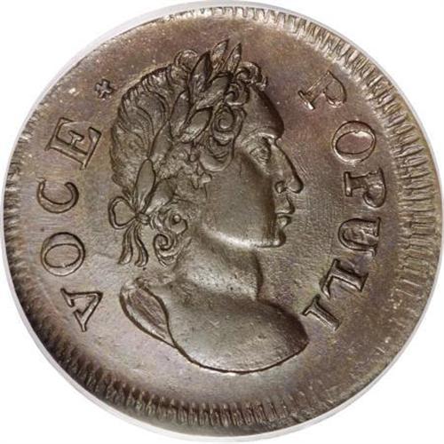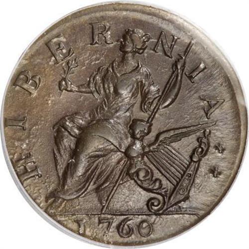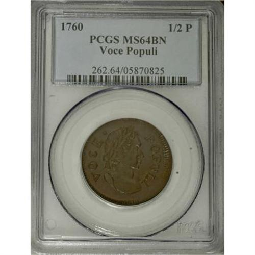 <B>1760 1/2P Hibernia-Voce Populi Halfpenny MS64 Brown PCGS.</B></I> Z. 2-A, N.4, R.1. A simply magnificent Voce Populi type coin. The chocolate-brown surfaces shimmer with luster, and the fields exhibit prominent die polish lines that further confirm the absence of wear. The strike is essentially complete, and there is no indication of carbon or contact. The present auction has numerous outstanding Voce Populi coppers, and provides an unusual opportunity for those assembling the finest quality collections. Population: 8 in 64, 0 finer (1/08).<BR><BR><b>Shipping:</b> Coins & Currency (<a target="_blank" href="http://www.heritageauctions.com/common/shipping.php">view shipping information</a>)