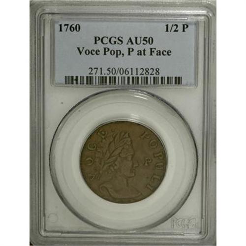 <B>1760 1/2P Hibernia-Voce Populi Halfpenny, P Before Face AU50 PCGS.</B></I> Z. 15-N, N.12, R.2. A lovely chocolate-brown representative that has excellent centering and only faint marks on the cheek. From a problem-free planchet. Listed on page 47 of the 2008 <I>Guide Book</B></I>.<BR><BR><b>Shipping:</b> Coins & Currency (<a target="_blank" href="http://www.heritageauctions.com/common/shipping.php">view shipping information</a>)