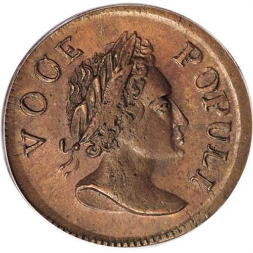 <B>1760 1/2P Hibernia-Voce Populi Halfpenny, VOOE POPULI MS64 Brown PCGS.</B></I> Z. 7-E, N. 3, R.3. A gorgeous chocolate-brown near-Gem with an uncommonly sharp strike and splendidly smooth surfaces. Flawless aside from minor reverse rim imperfections near 4 o'clock. The single-finest certified example of this <I>Guide Book</B></I>-listed engraving blunder. The C in VOCE is cut over an O. In its Stack's catalog appearance, the present piece was described as "among the finest known" and "finer than Taylor ... and Norweb." The Goldbergs described it as "better than the Garrett or Norweb examples, as well as ... Roper." To this we can add that it is also finer than the Ford-Boyd-Ryder example. Listed on page 47 of the 2008 <I>Guide Book</B></I>. Population: 1 in 64, 0 finer (1/08).<BR><I>Ex: James A. Stack, Sr. Collection (Stack's, 3/95), lot 9; Paul Arthur Norris Collection (Ira & Larry Goldberg, 9/02), lot 33.</B></I><BR><BR><b>Shipping:</b> Coins & Currency (<a target="_blank" href="http://www.heritageauctions.com/common/shipping.php">view shipping information</a>)