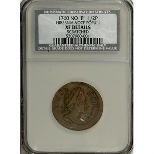 <B>1760 1/2P -Hibernia-Voce Populi Halfpenny No"P"--Scratched--NCS. XF Details.</B></I> NGC Census: (0/0). PCGS Population (21/94). (#262)<BR><BR><b>Shipping:</b> Coins & Currency (<a target="_blank" href="http://www.heritageauctions.com/common/shipping.php">view shipping information</a>)
