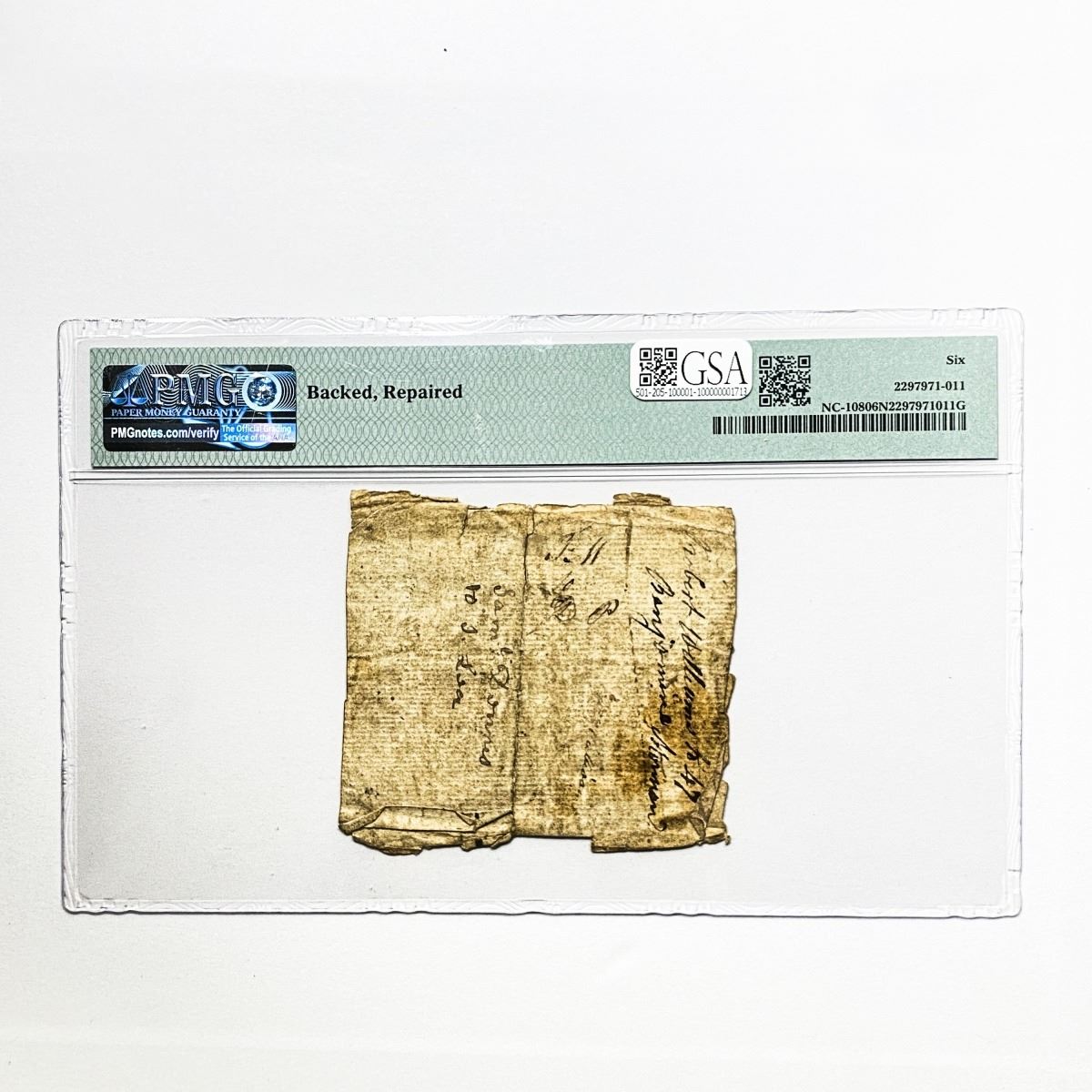 f. Notes sold referencing a third-party grading service are sold “AS IS” without any express or implied warranty, except for guarantee by GSA that they are genuine. Grading, condition or other attributes of any Product may have a material effect on its value and the opinion of others, including third-party grading services such as PCGS Currency and PMG may differ with that of GSA. GSA shall not be bound by any prior or subsequent opinion, determination, or certification by any grading service. Bidders specifically waive any claim to right of return of any Product because of the opinion, determination, or certification, or lack thereof, by any grading service. Certain warranties may be available from the grading services and Bidders are referred to them for further details: Paper Money Guaranty (PMG), PO Box 4711, Sarasota, FL 34230; PCGS Currency, PO Box 10470, Peoria, IL 61612-0470; PCGS Gold Shield, PO Box 9458, Newport Beach, CA 92658. Third-party graded notes are not returnable for any reason whatsoever.