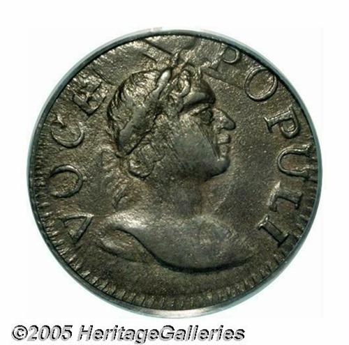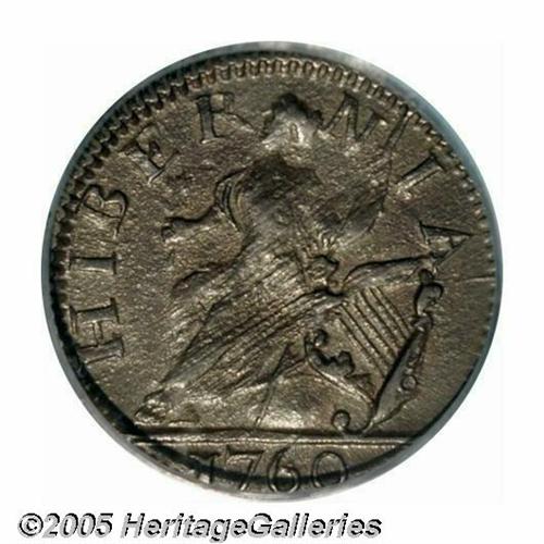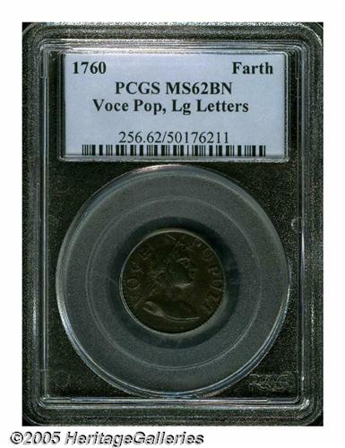 <B>1760<FARTH> Hibernia-Voce Populi Farthing, Large Letters MS62 Brown PCGS.</B></I> Breen-234. Dark brown surfaces with numerous planchet striations on the obverse and a somewhat rough appearance on the reverse. The large letters and plain loop bust truncation identify this variety of the very scarce Farthing denomination. An elusive Irish import token issue that was stated in the Roper catalog to be "probably fifty times rarer than the Halfpenny."
