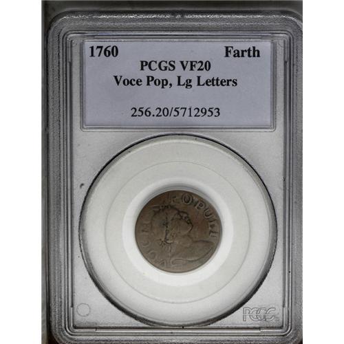 <B>1760<FARTH> Hibernia-Voce Populi Farthing, Large Letters VF20 PCGS.</B></I> Breen-234. A smooth chocolate-brown example with a whisper of charcoal buildup in protected areas. Voce Populi farthings are many times rarer than the halfpence. Listed on page 47 of the 2006 <I>Guide Book.</B></I><BR><I>From The Steve Glenn Collection.</B></I> <BR><BR><B>Important notice:</B> Heritage usually auctions material at the rate of 200-250 lots per hour. On some occasions eBay Live bid software or the Internet may not be able to keep up with the pace of the auction. We recommend placing a realistic absentee bid now as insurance to avoid disappointment. Occasionally the auctioneer may eliminate or reject an eBay Live bid, and the auctioneer may also reopen a lot after the close of the eBay live bidding (usually because we missed an audience bid), and may reject your bid even if it shows you as the winning bidder. By bidding via eBay Live, you agree that Heritage may award the lot to another bidder at its sole discretion under the circumstances described above or any other reasonable circumstances. Since eBay bids are not shown to us until we open the lot on the floor, we treat those bids just like floor bids. In most cases the floor responds before the eBay bid is presented to us, due to Internet lag time, so for consistency we have made it a policy that floor bids are always considered first over tie eBay live bids. Also please note that all Heritage lots purchased through eBay Live carry a 20% Buyer's Premium. Please make sure you read the Terms and Conditions before you bid. This lot is being auctioned in conjunction with a live floor auction by Heritage Galleries & Auctioneers. All final auction and invoice information will be supplied by Heritage Galleries & Auctioneers, and all other information should be considered preliminary. Lot:51 <BR><BR><B>Winning Notification and Billing:</B> After the FINAL session in this auction is complete, Heritage will send e-mail and snail mail invoices. This process normally takes several days. All final auction and invoice information will be supplied by Heritage Galleries & Auctioneers, and all other information should be considered preliminary. <BR><BR>This auction will be conducted on a live auction floor and over the Internet through eBay Live. If you choose to place an absentee bid, please take a moment to <font color='#0000ff'><u><a href='http://pages.ebay.com/liveauctions/help/before/laabsentee.html'>learn how eBay Live absentee bidding works</a></u></font><font color='#000000'>