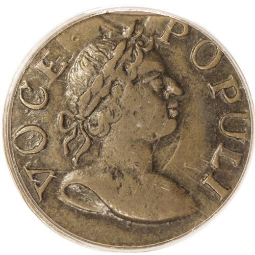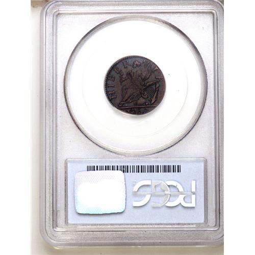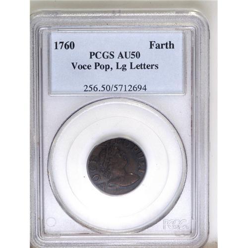 <B>1760<FARTH> Hibernia-Voce Populi Farthing, Large Letters AU50 PCGS.</B></I> Breen-234, "Rare." Chestnut-brown in the centers, with darker patina throughout the peripheral legends. The planchet has a small straight clip that affects part of the 1 in the date. Voce Populi farthings are many times rarer than the halfpence and come in just two varieties, the other being prohibitively rare. Voce Populi coinage were private issues that filled a need for circulating coppers until Irish Regal coins were issued in 1766. Listed on page 47 of the 2007 <I>Guide Book.</B></I> Population: 3 in 50, 9 finer (7/06).