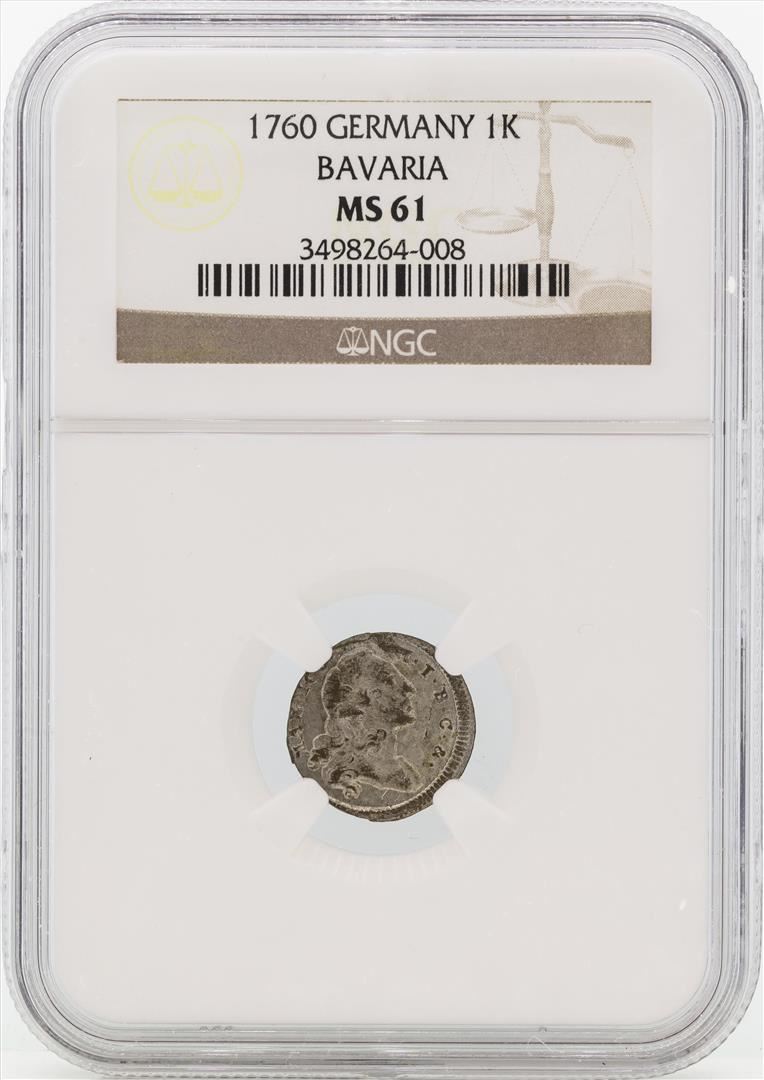One 1760 Germany Bavaria 1 Kreutzer Coin NGC MS61. NGC Certified.