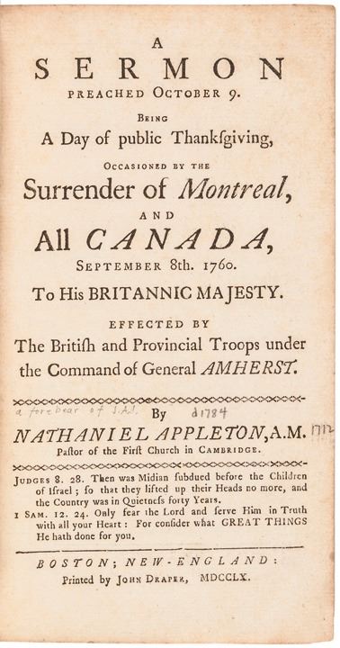 Appleton, Nathaniel. Oct. 9. Being a day of public thanksgiving, occasioned by the surrender of Montreal, & Canada ... effected by the British & Provincial troops under ... General Amherst. marbled wrappers. Boston. 1760.” to His Britannic Majesty.”
