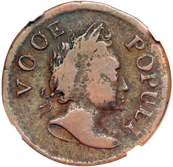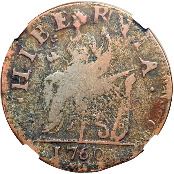 1760 Voce Populi Halfpenny Nelson-3 ("VOOE" variety) Rarity-3. NGC graded VG-10. Steel brown and light chocolate with lighter brown toning on the highpoints. The highpoints are smooth while fine roughness covers the protected areas. No marks or verdigris. The date and legends are complete and clear. The "VOOE" variety feature is noted on the NGC label.
