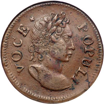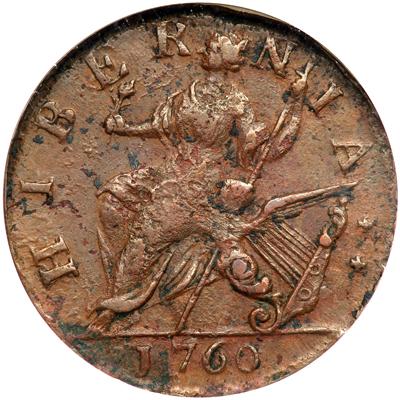 1760 Voce Populi Halfpenny Nelson-4 Rarity-3. NGC graded MS-61. Frosty medium brown and light chocolate with specks of dark olive verdigris in the mix, mostly on the reverse. Many of these specks appear to be bits of impurity in the planchet itself, but they distract from the eye appeal regardless of their origin. Otherwise this piece is nicely struck and free of notable marks. Variety without the added "P" on the obverse. Pop 1; 11 finer, 8 in 62, 2 in 63, 1 in 64.