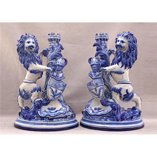 1700s stunning Pair of large Delftware Candlesticks Surmounted With Heraldic Lions And Shields c1760</em></td>